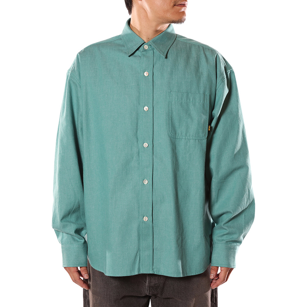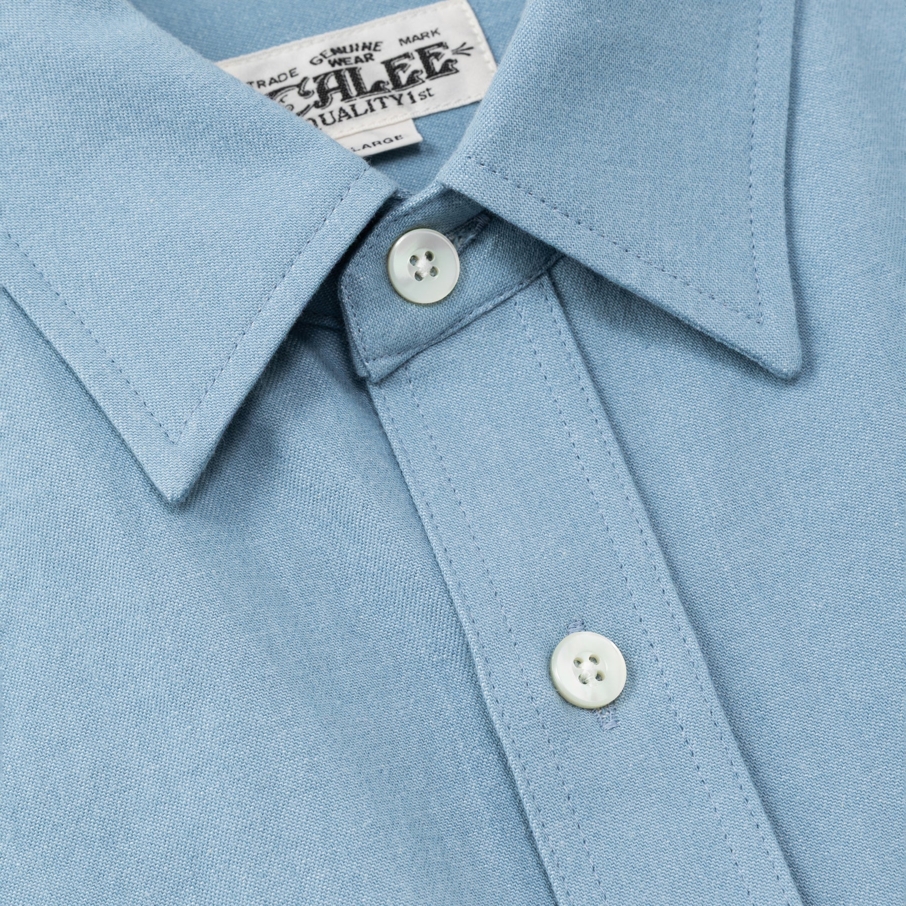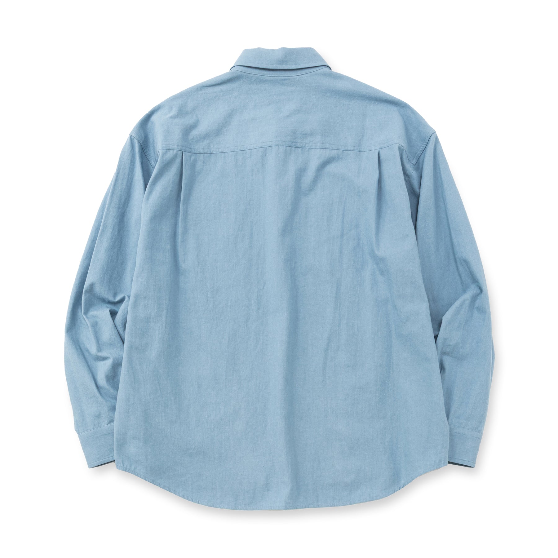 ライトオンスカラーデニムL/Sシャツ。ワッシャーソフロン加工を施した、6ozのライトカラーデニムを採用。台襟ラウンドシルエット。裾にプリントが入る。