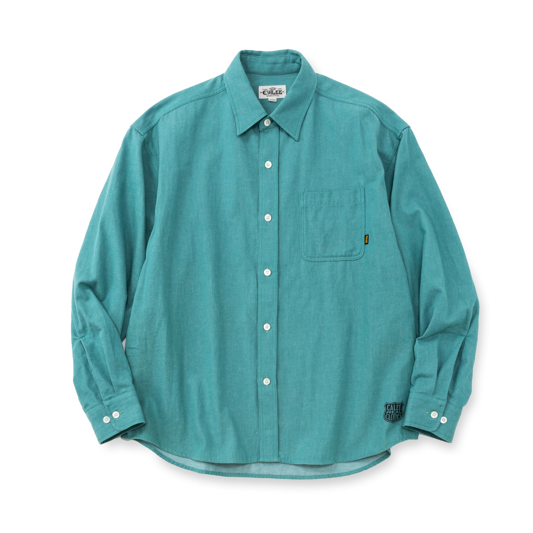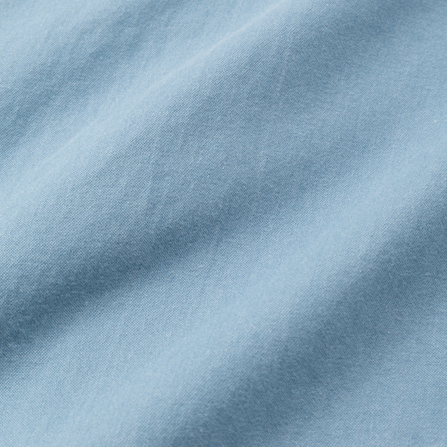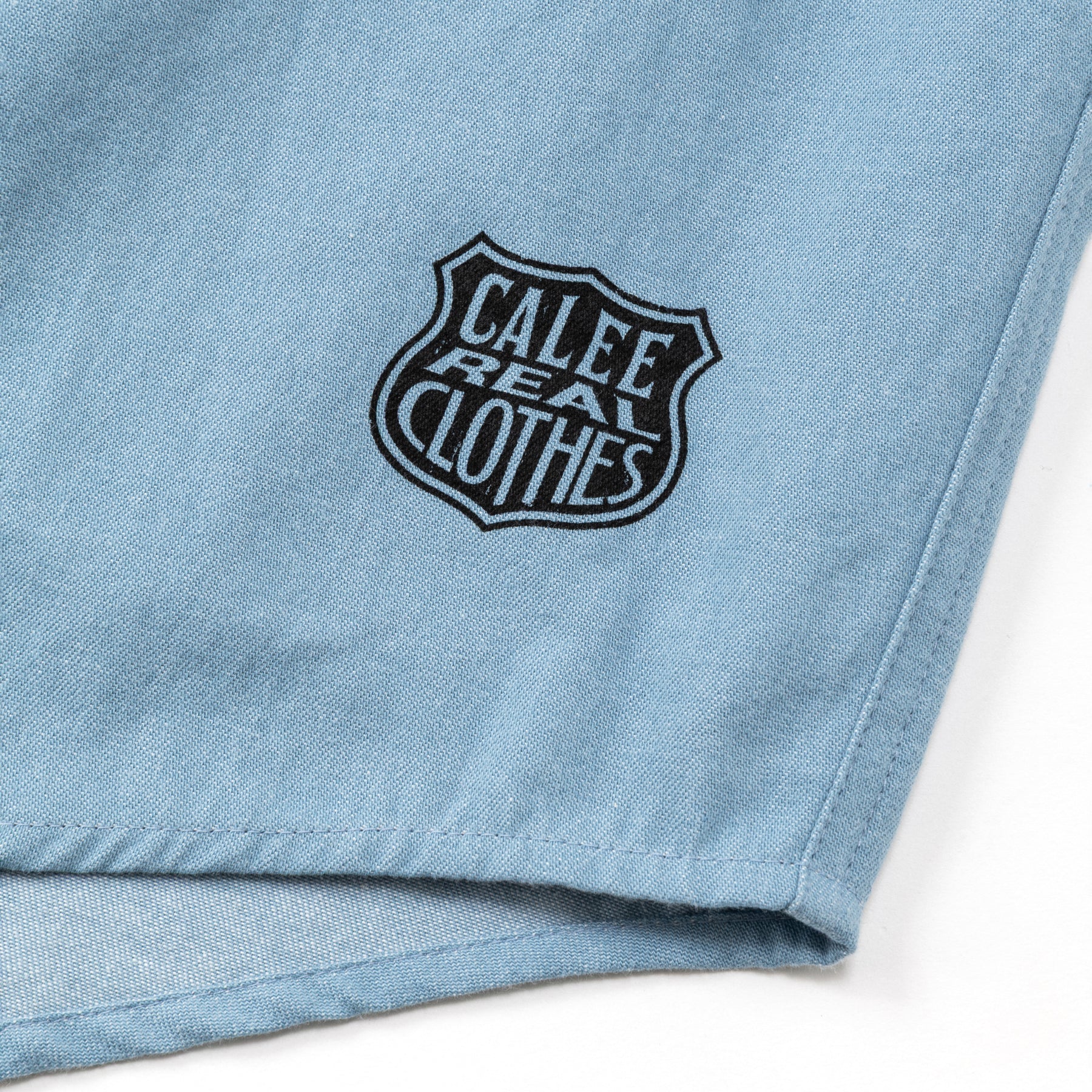 ライトオンスカラーデニムL/Sシャツ。ワッシャーソフロン加工を施した、6ozのライトカラーデニムを採用。台襟ラウンドシルエット。裾にプリントが入る。