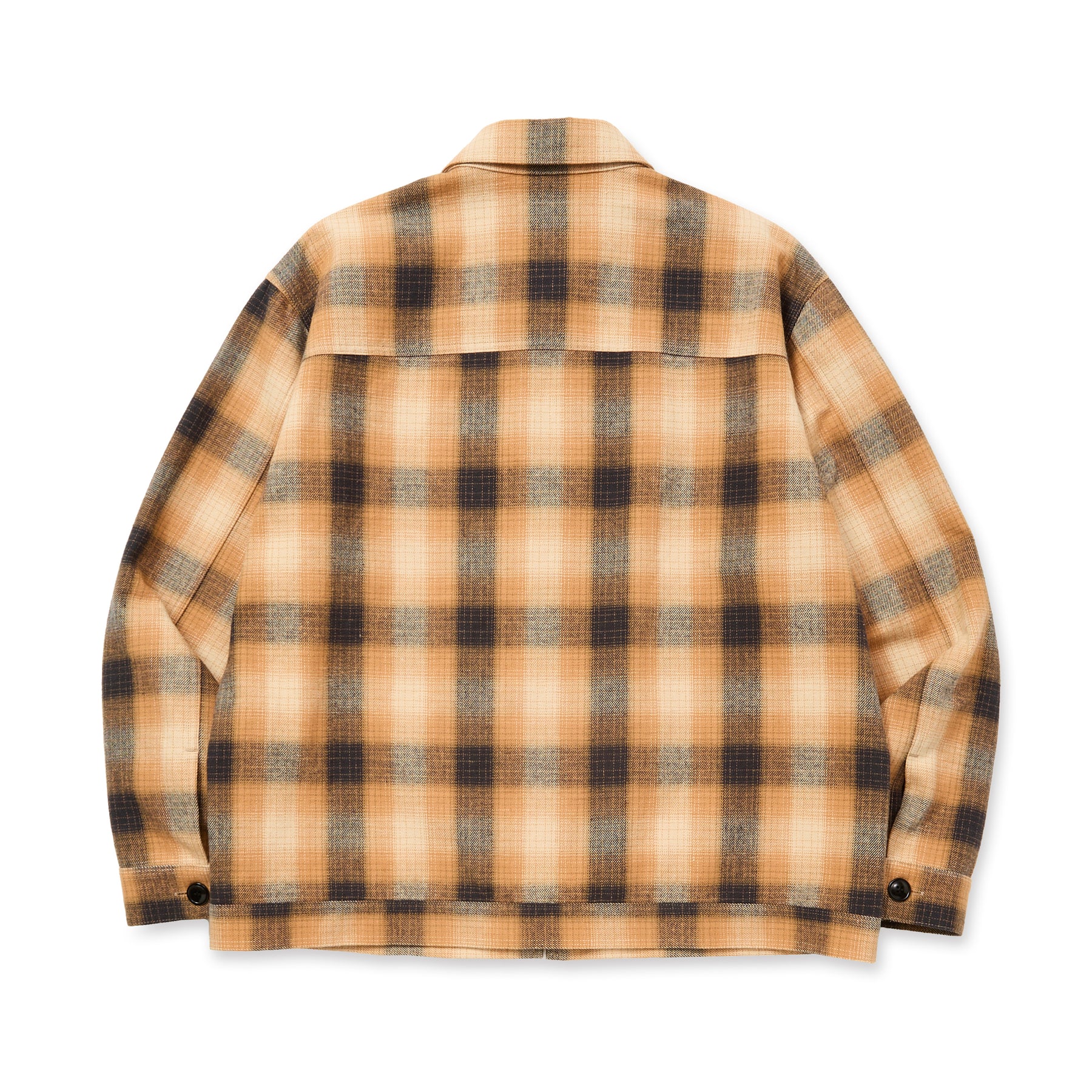オンブレーチェックスウィングトップ。新潟県長岡市の栃尾産地にて製作した、4色の色糸を使用したオリジナルオンブレーチェック生地を採用。太番手の8番単糸を2/2綾織りと呼ばれる経緯二本ずつで織り上げ、表面を薄く起毛加工を施している。身幅にゆとりを持たせたショート丈シルエット。