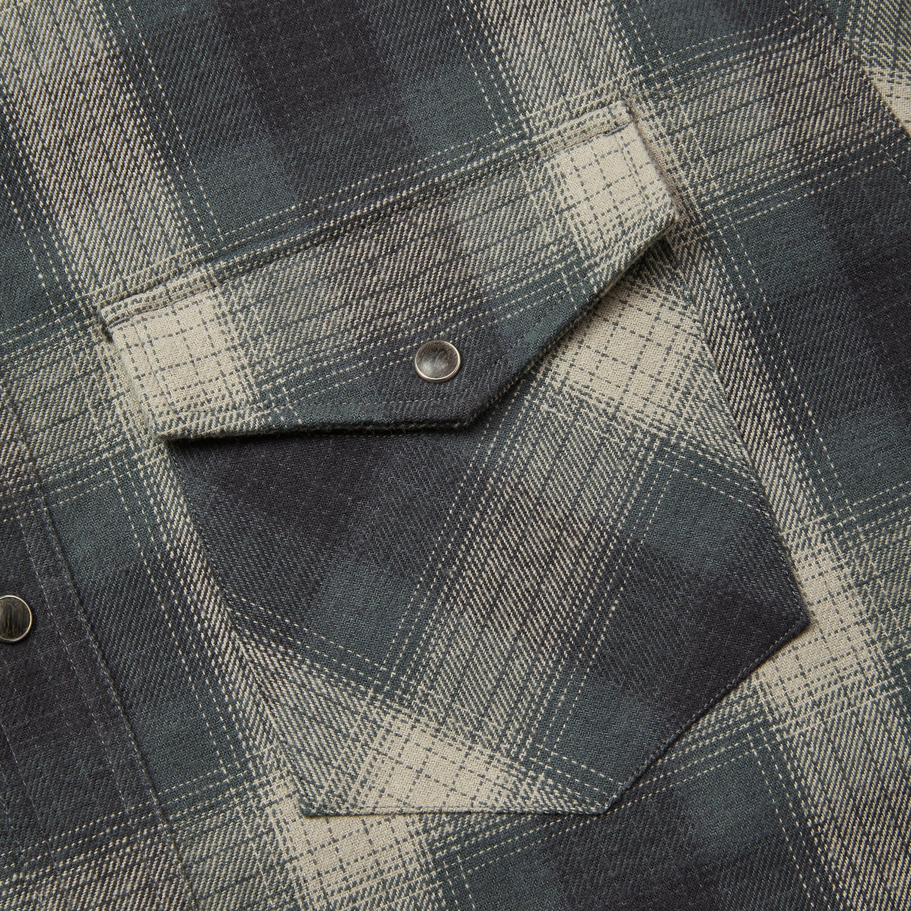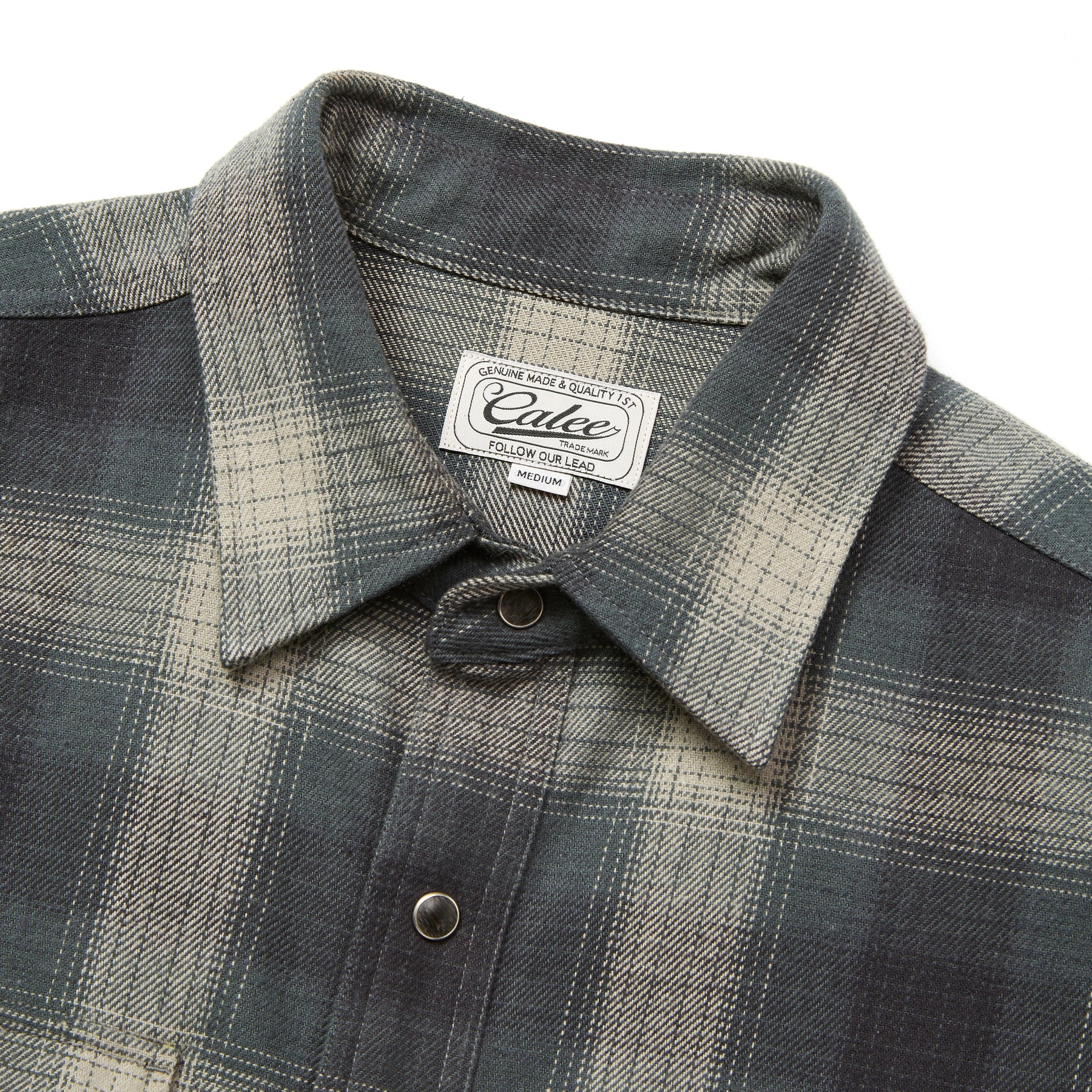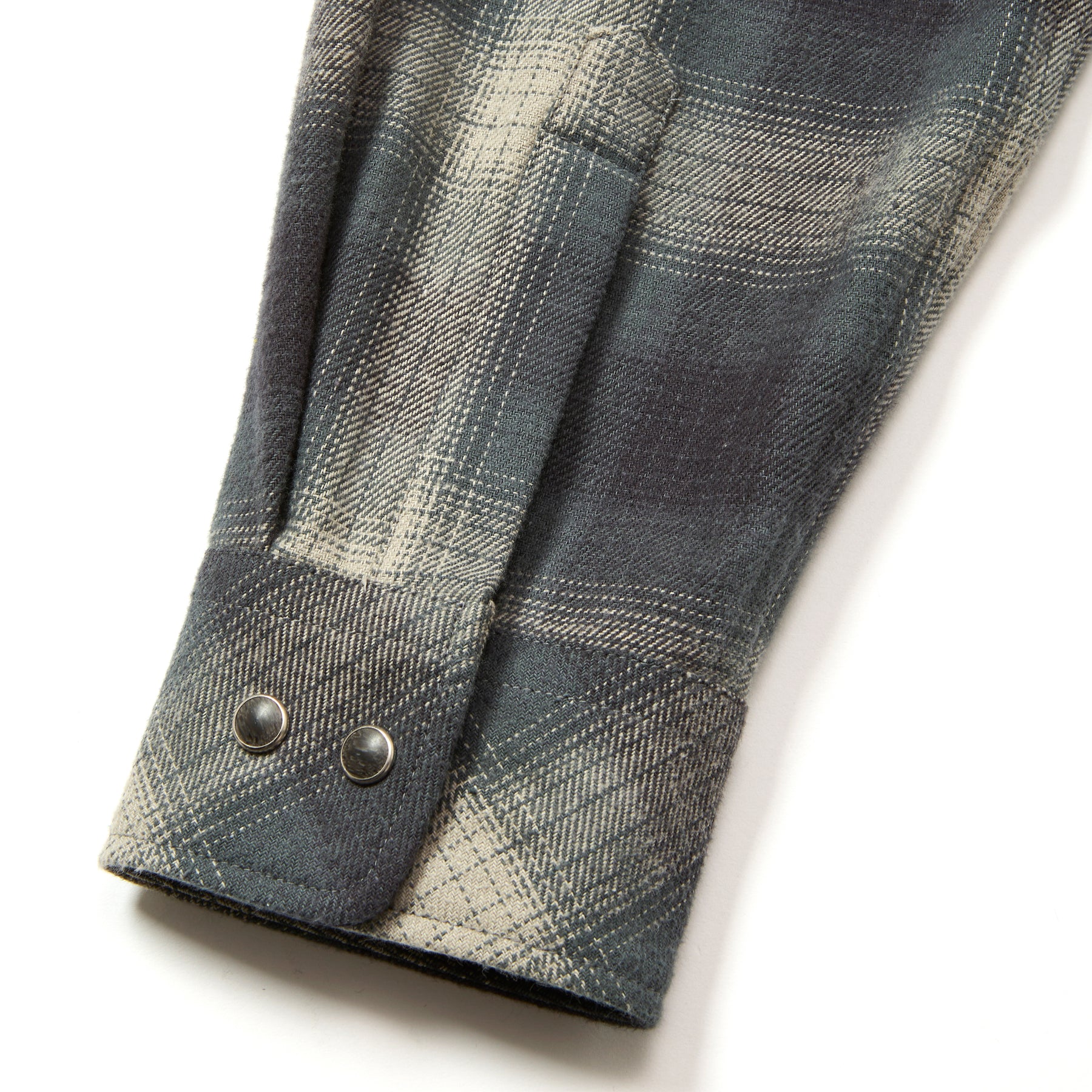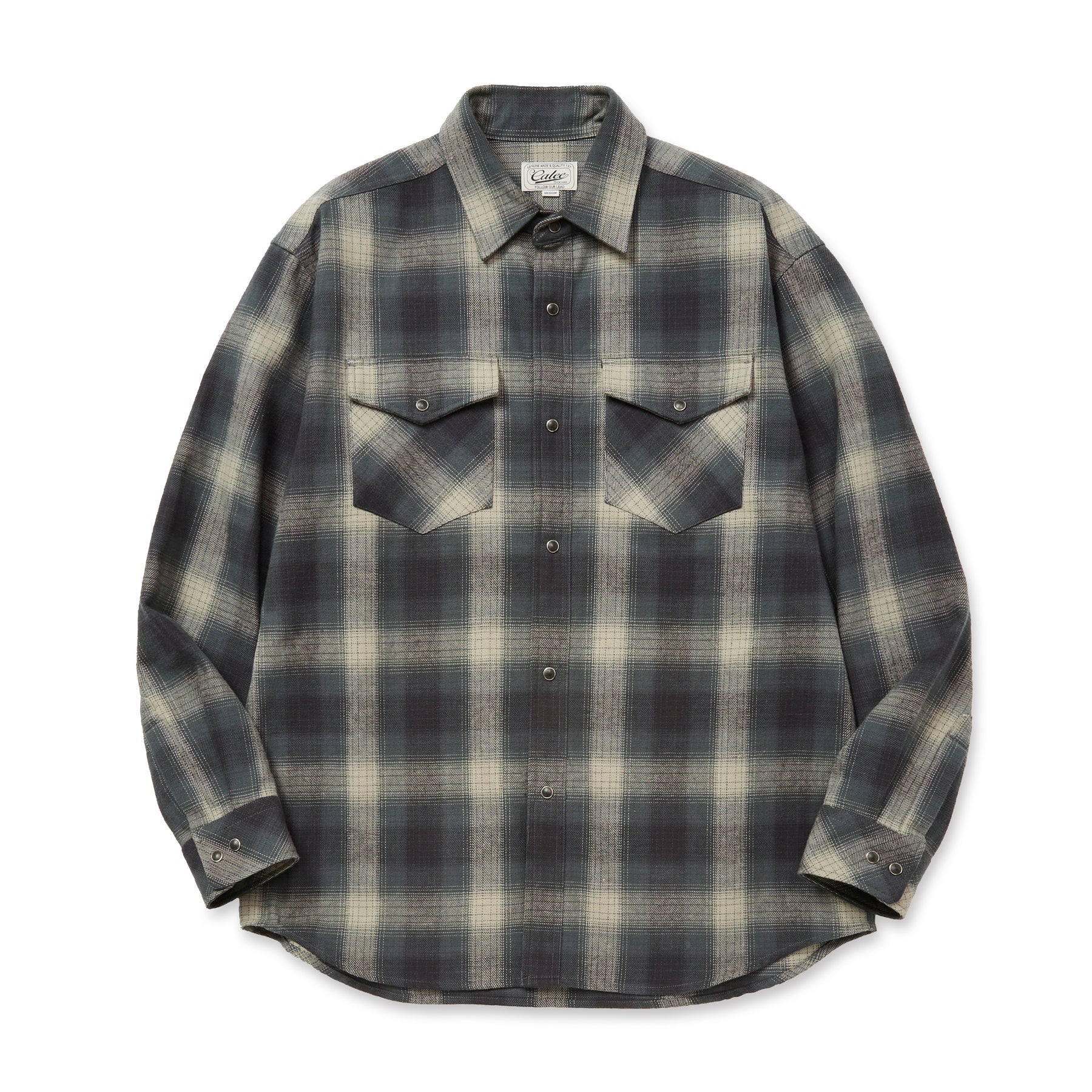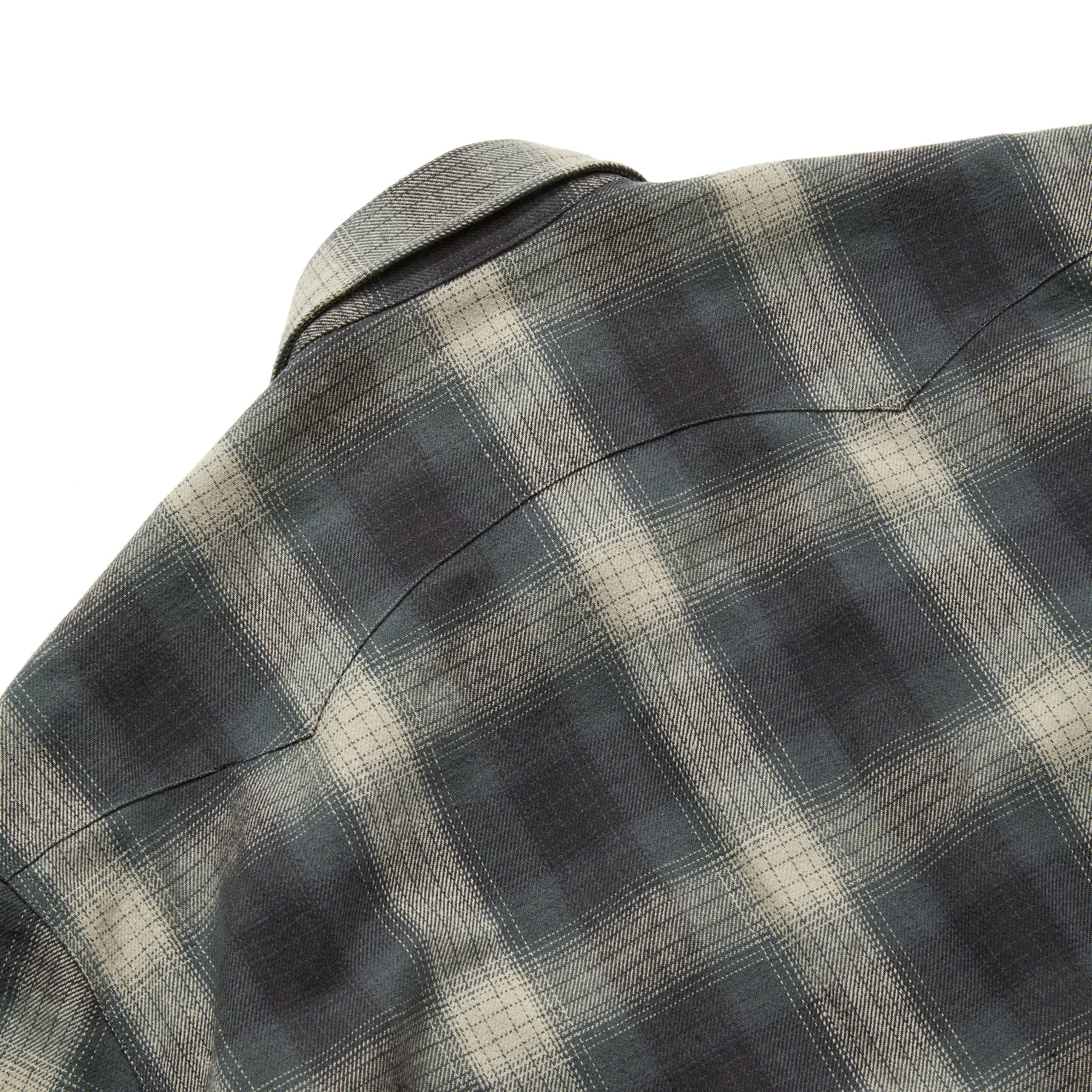 オンブレーチェックウエスタンL/Sシャツ。新潟県長岡市の栃尾産地にて製作した、4色の色糸を使用したオリジナルオンブレーチェック生地を採用。太番手の8番単糸を2/2綾織りと呼ばれる経緯二本ずつで織り上げ、表面を薄く起毛加工を施している。バックヨーク、フラップポケット、パールドットボタンなどのウエスタンディテール。身幅にゆとりを持たせた裾ラウンドシルエット。