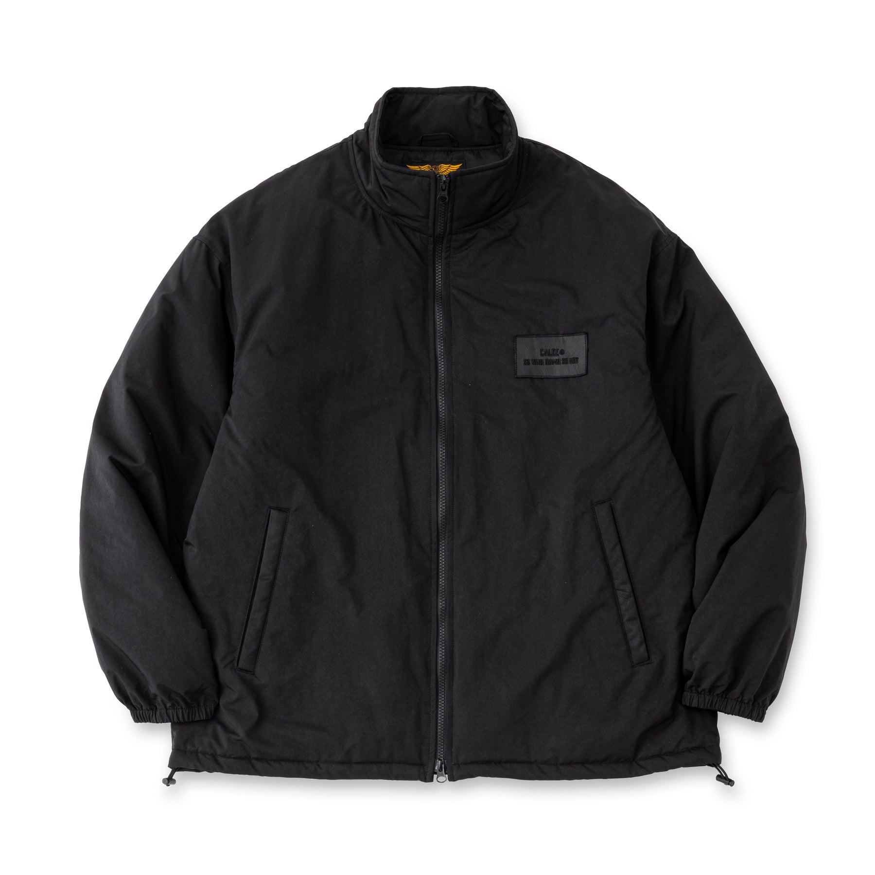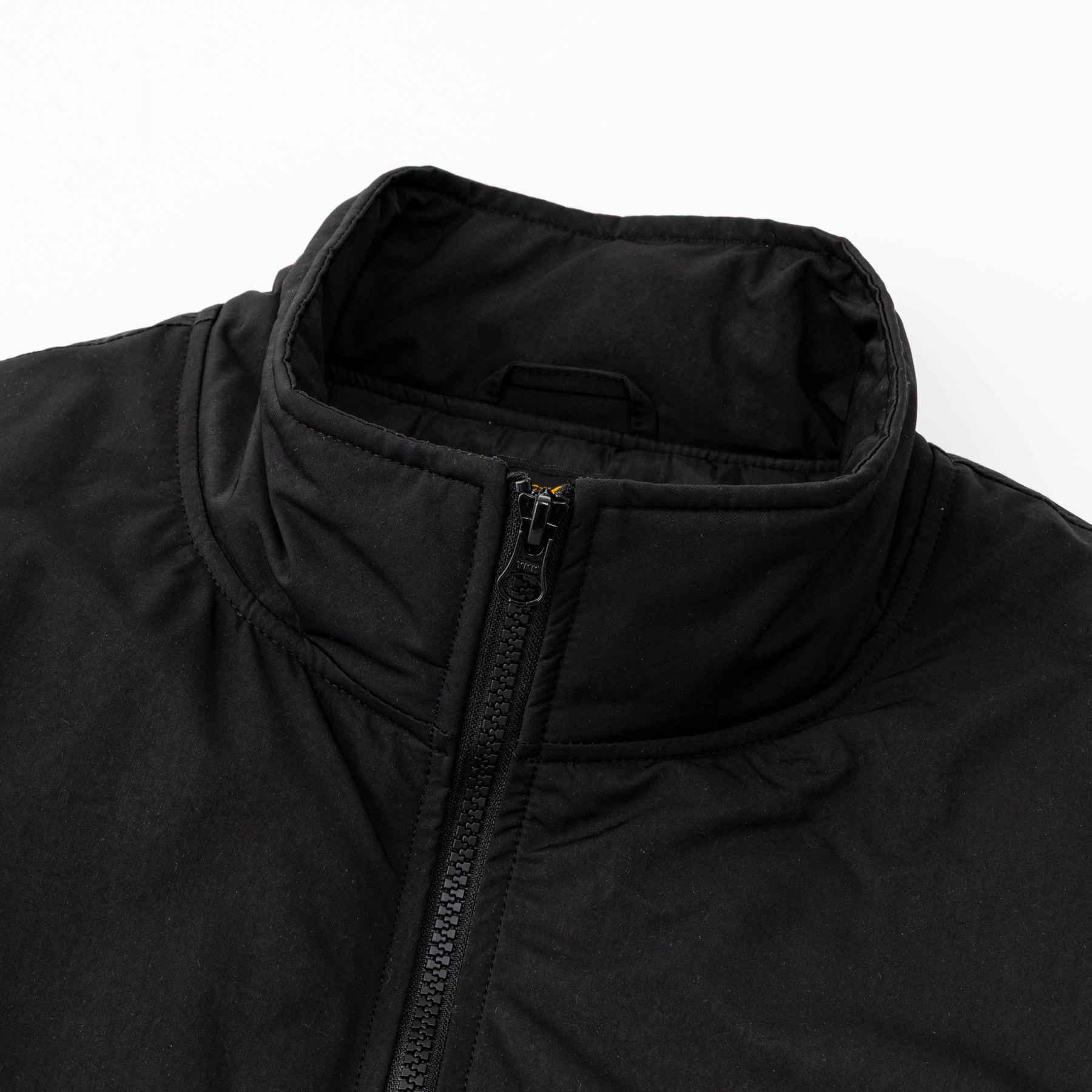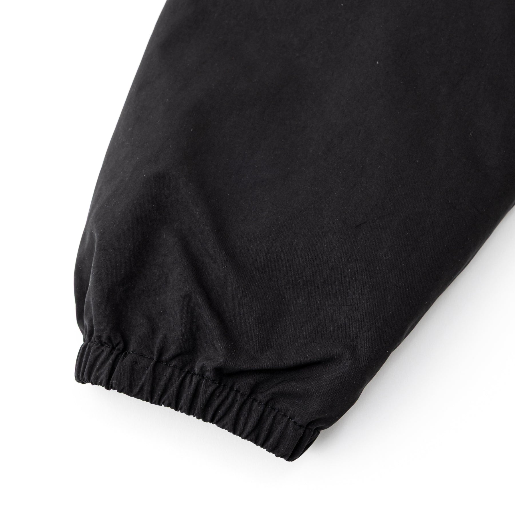 トラックジャケット。ポリエステル/ナイロンツイルを特殊加工で極限まで密度を高めて製作した生地ライトミリクロスにレザーワッペンを左胸に配した。裏地は高機能中綿入りWリップストップナイロン。裾ドローコード付き。