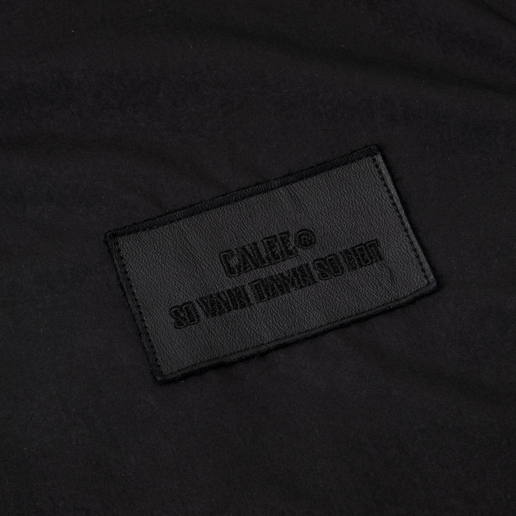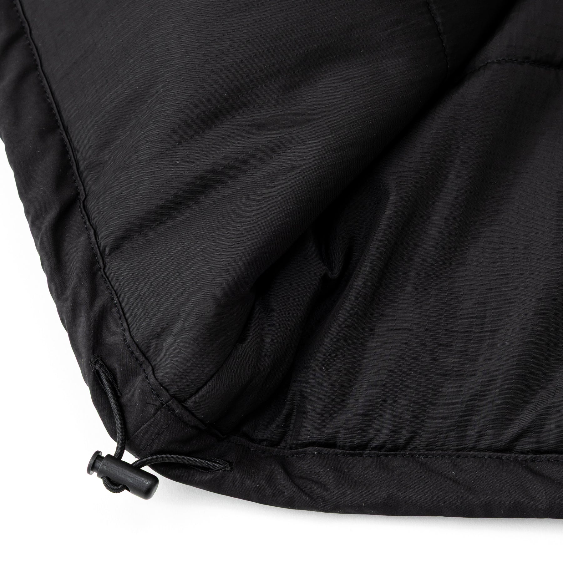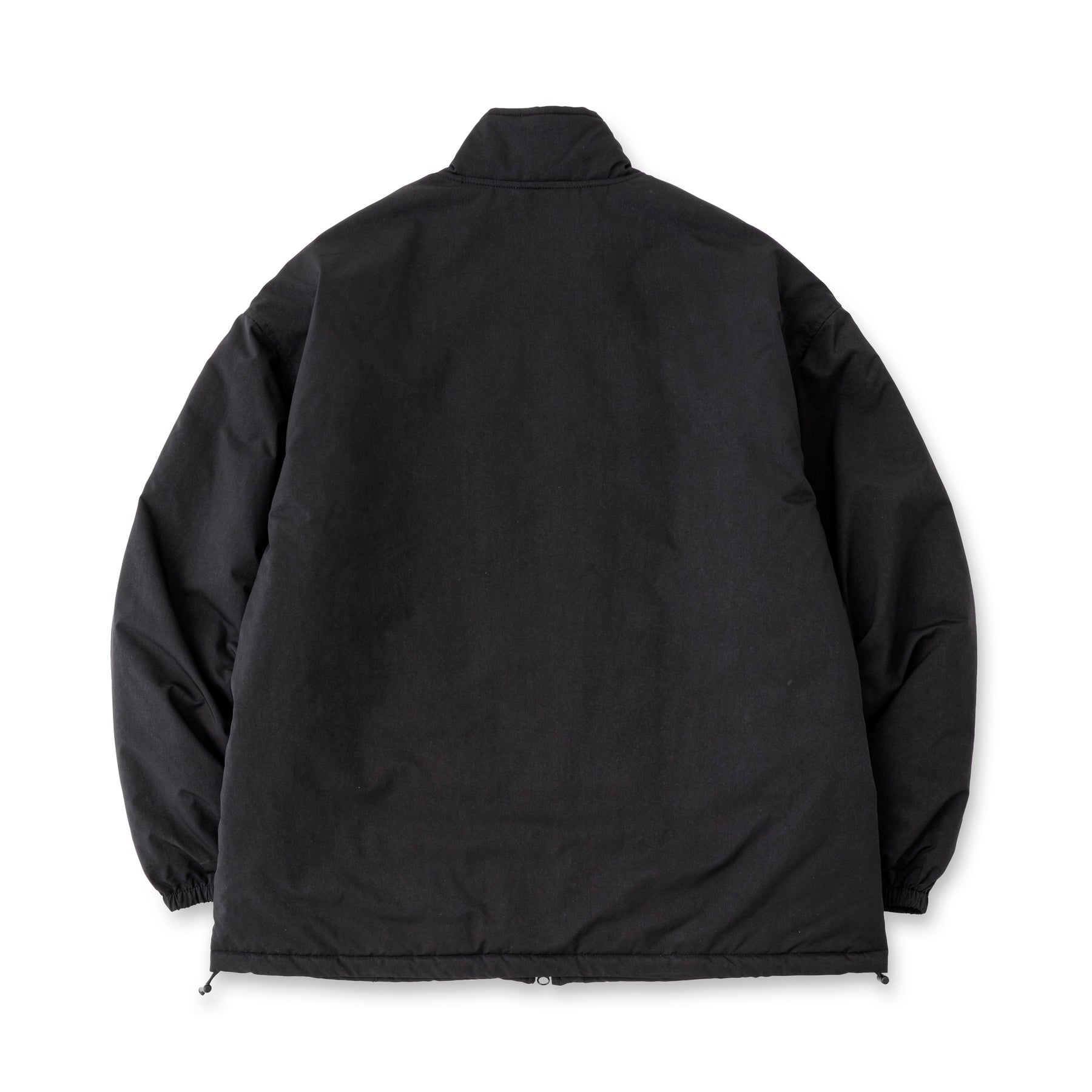 トラックジャケット。ポリエステル/ナイロンツイルを特殊加工で極限まで密度を高めて製作した生地ライトミリクロスにレザーワッペンを左胸に配した。裏地は高機能中綿入りWリップストップナイロン。裾ドローコード付き。