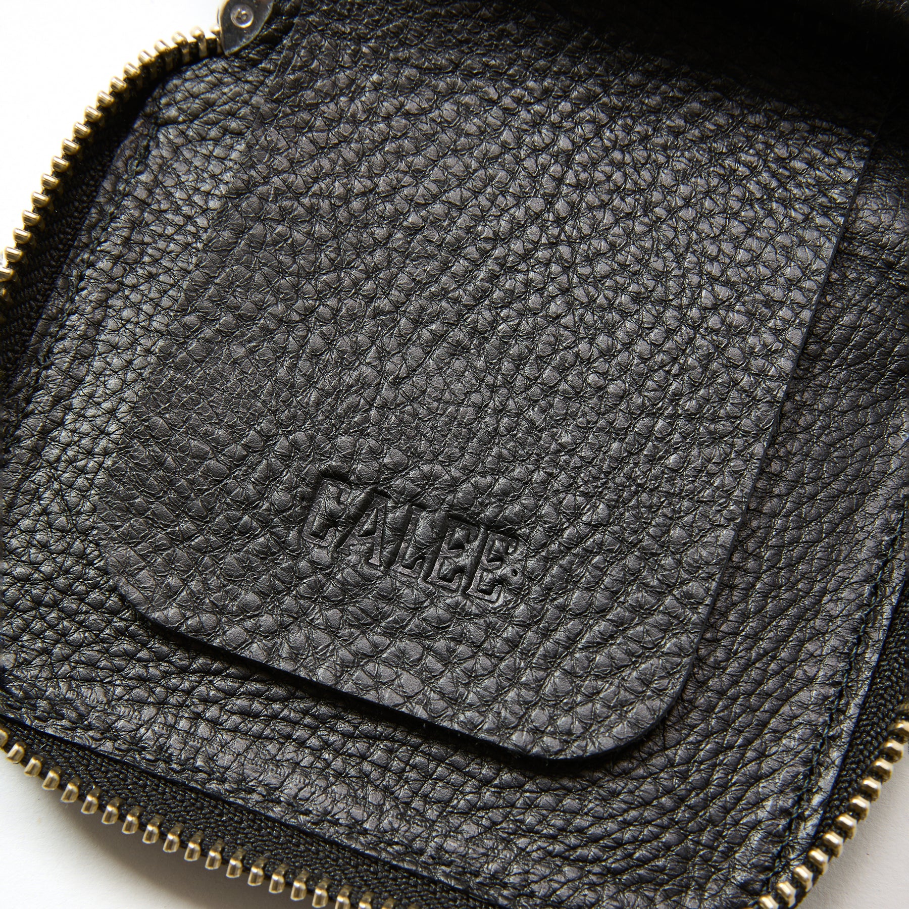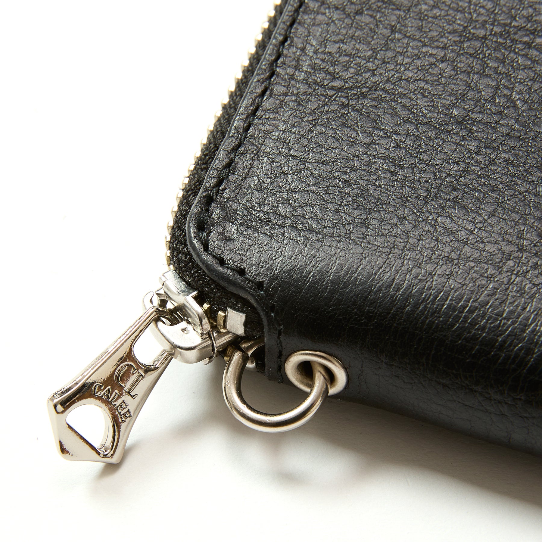 シボ感あるレザーにスタッズワークを施して作製された二つ折りジップウォレット。レザーは使い込む程にシボが消え、艶感ある経年変化を楽しむ事が出来る。また、収納もしっかりと確保し、使い勝手の良いウォレットに仕上がっている。