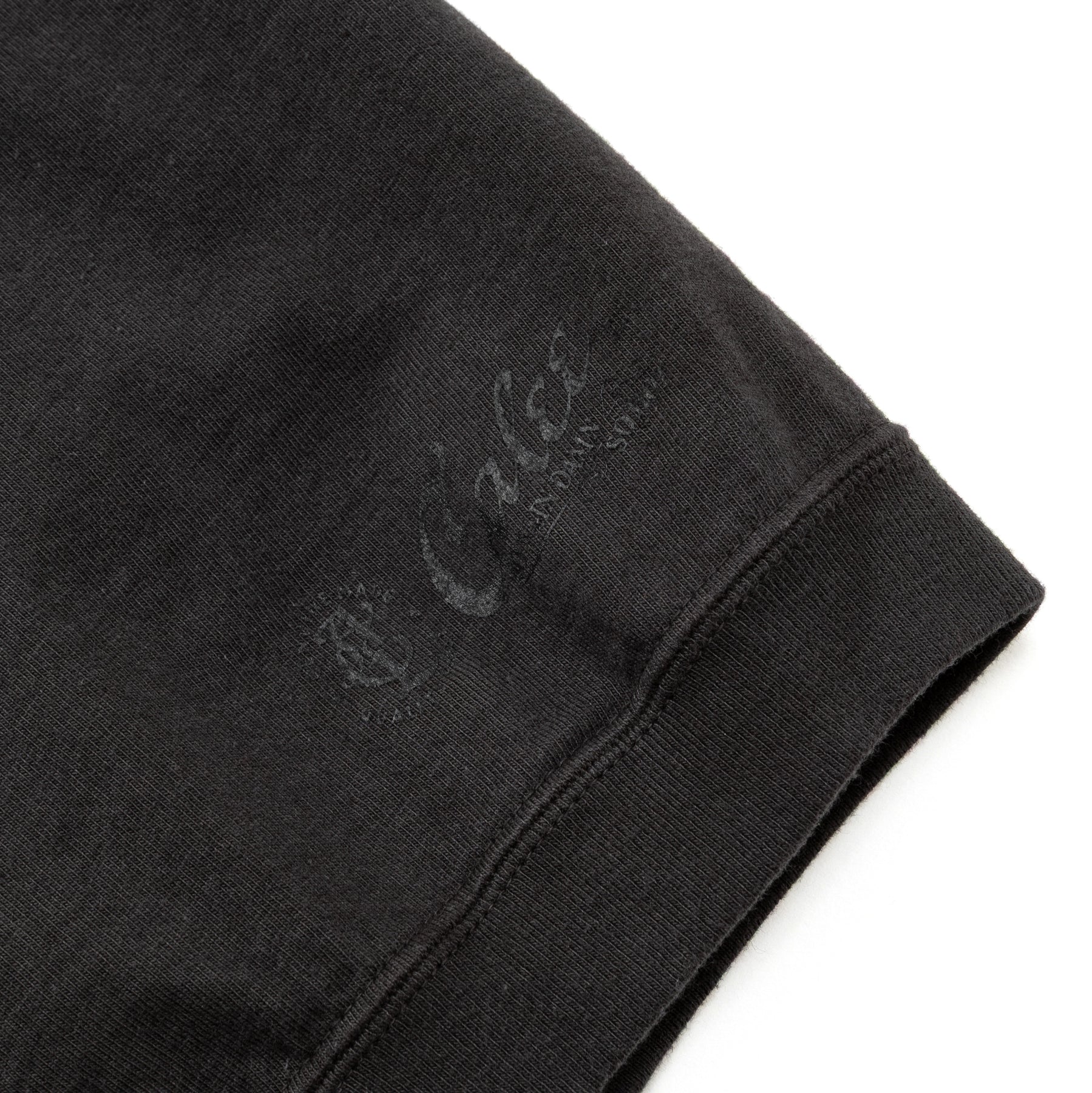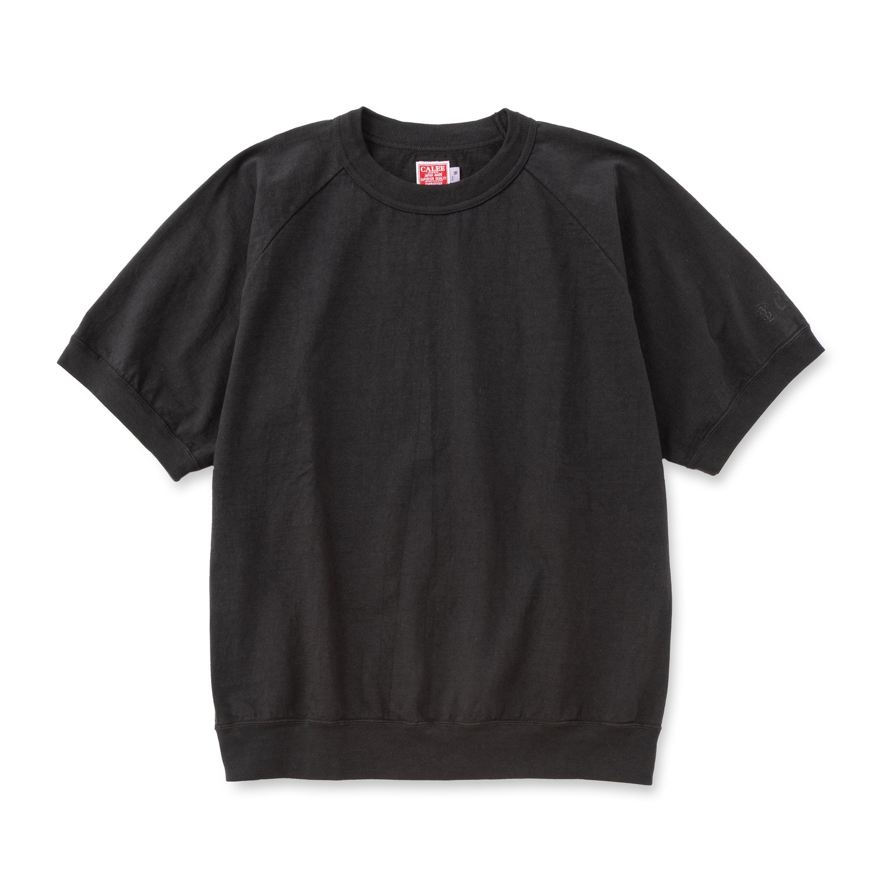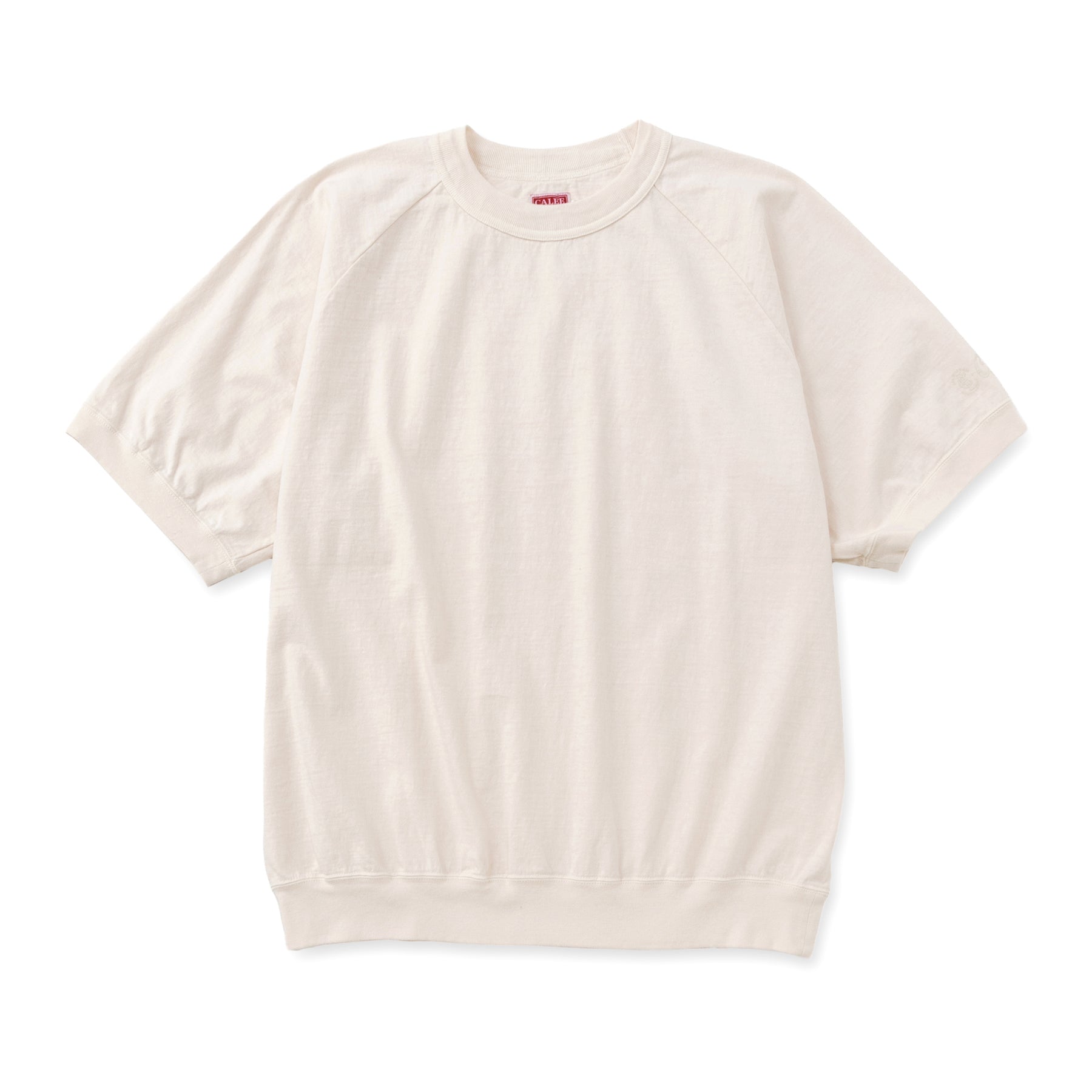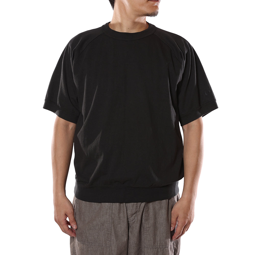 S/Sラグランカットソー。太めの糸で編立てたシンカー編み丸胴素材。袖、裾にはフライスリブを2本針で縫製。リブのテンションは70〜80年代を意識した緩めの着用感に。左袖にプリントが入る。