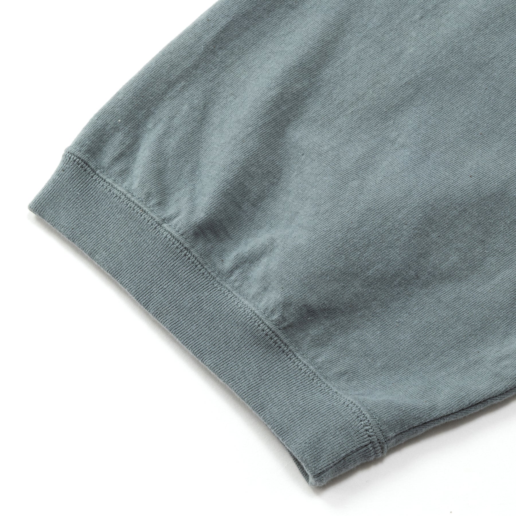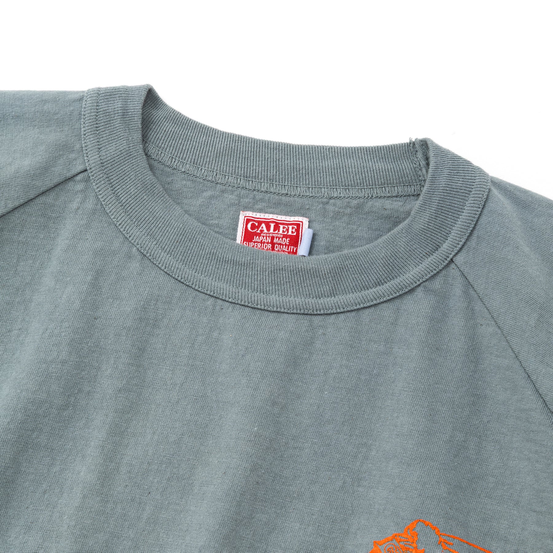 S/Sラグランカットソー。太めの糸で編立てたシンカー編み丸胴素材。袖、裾にはフライスリブを2本針で縫製。リブのテンションは70〜80年代を意識した緩めの着用感に。フロント左胸にプリントが入る。