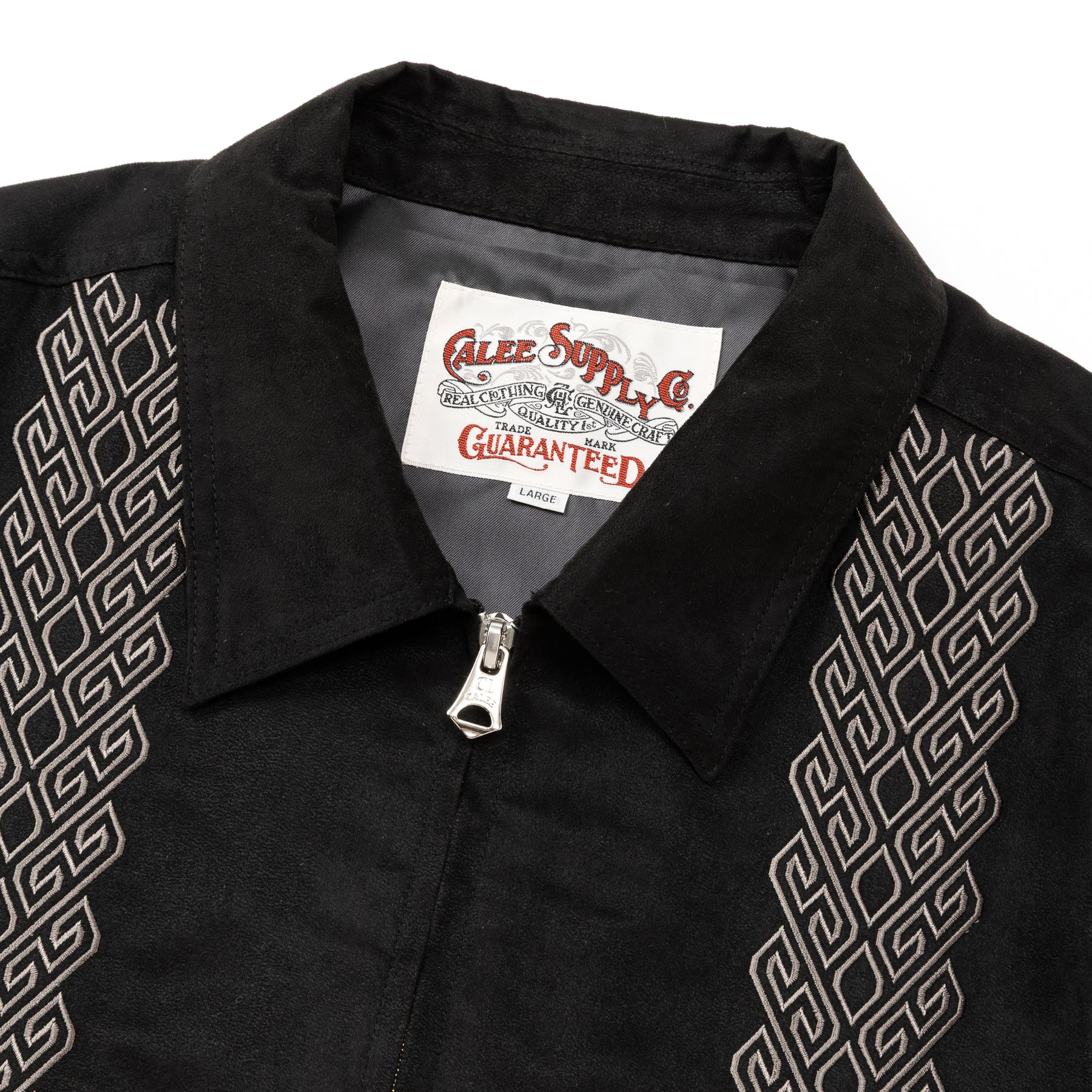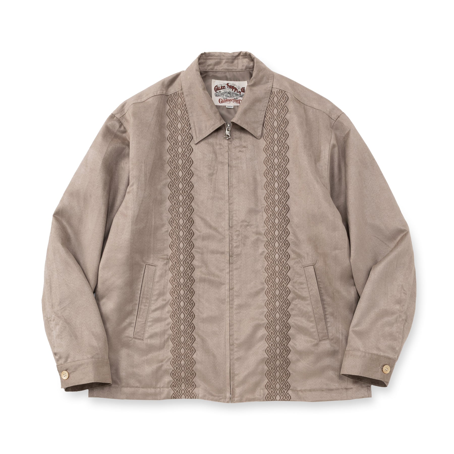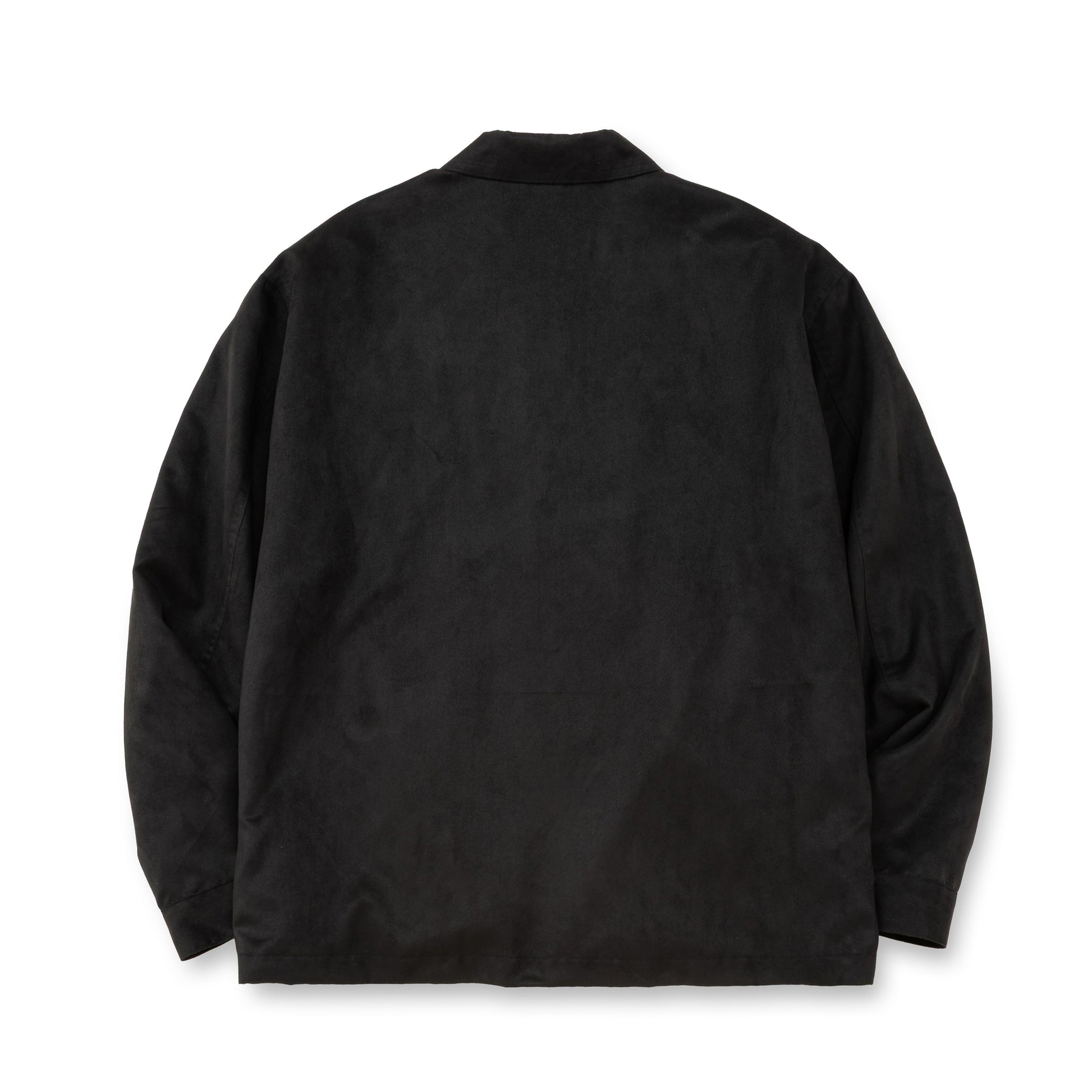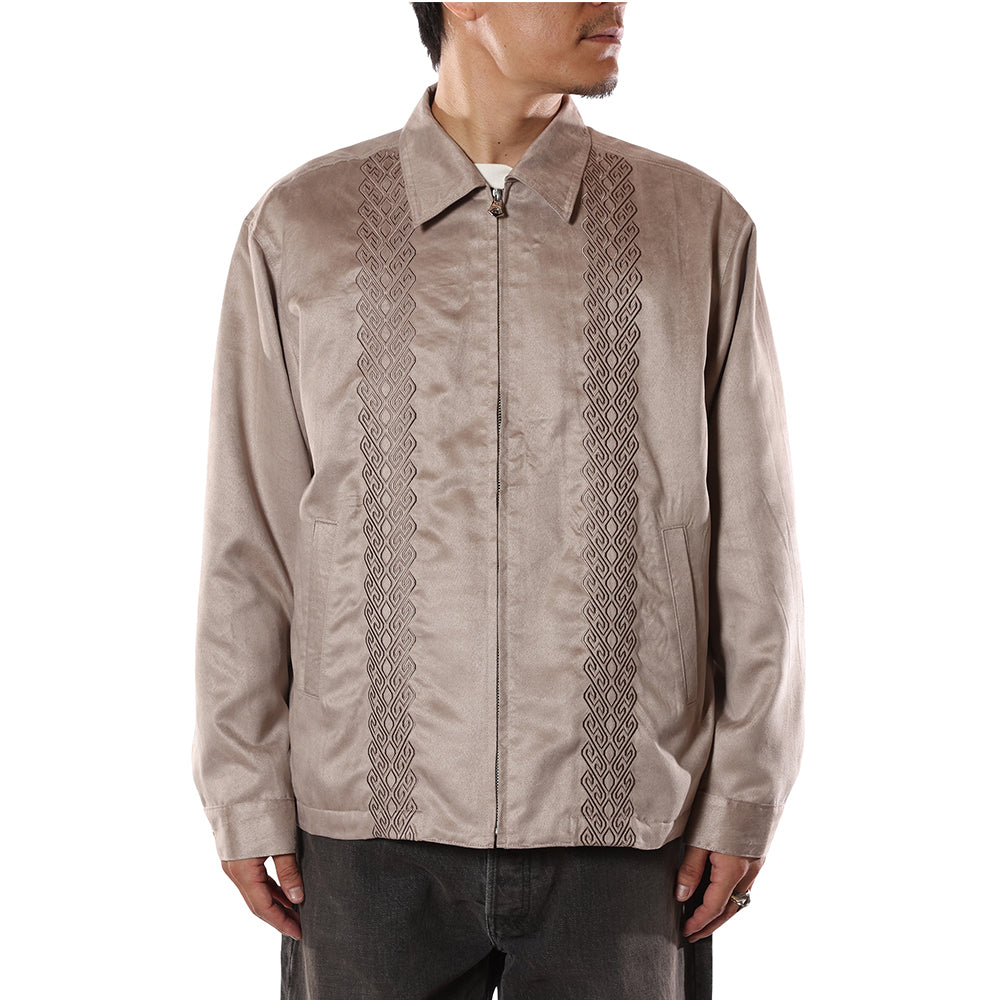 フェイクスエードスウィングトップ。しなやかな風合いと綺麗な表面感が特徴的なフェイクスエード生地を採用。特殊な割線糸と高収縮DTY糸を合撚した縦糸がポイントで、生機段階での割線処理や起毛処理を施している生地。フロント身頃にキューバシャツ風の刺繍が入る。