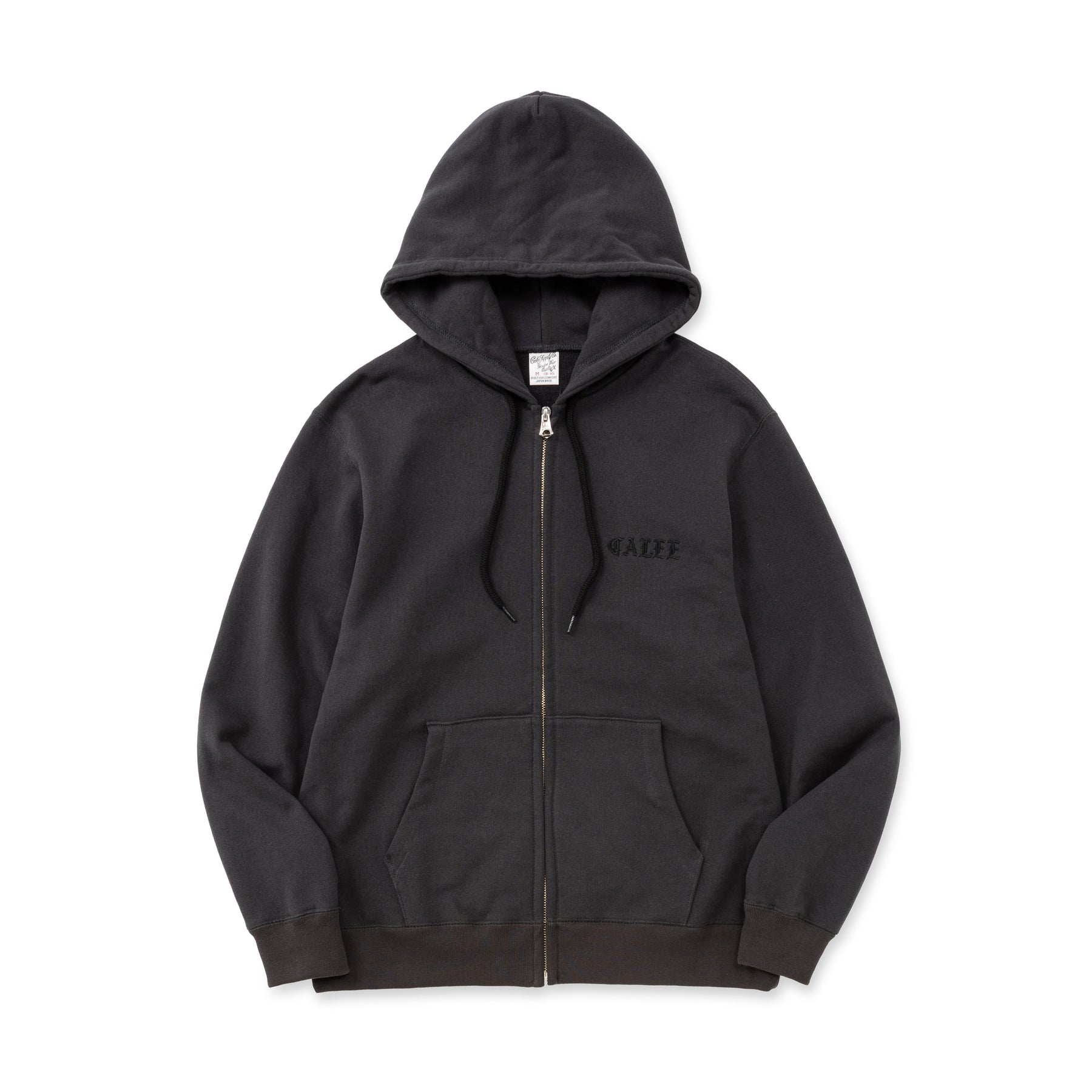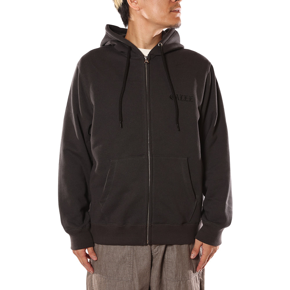 ZIPフーディー。紡績、編み、加工などの全ての工程を国内生産で行っている裏毛素材を採用。ヴィンテージ感ある面構えと独特なドライタッチで膨らみがあるのが特徴。左胸に刺繍が入る。