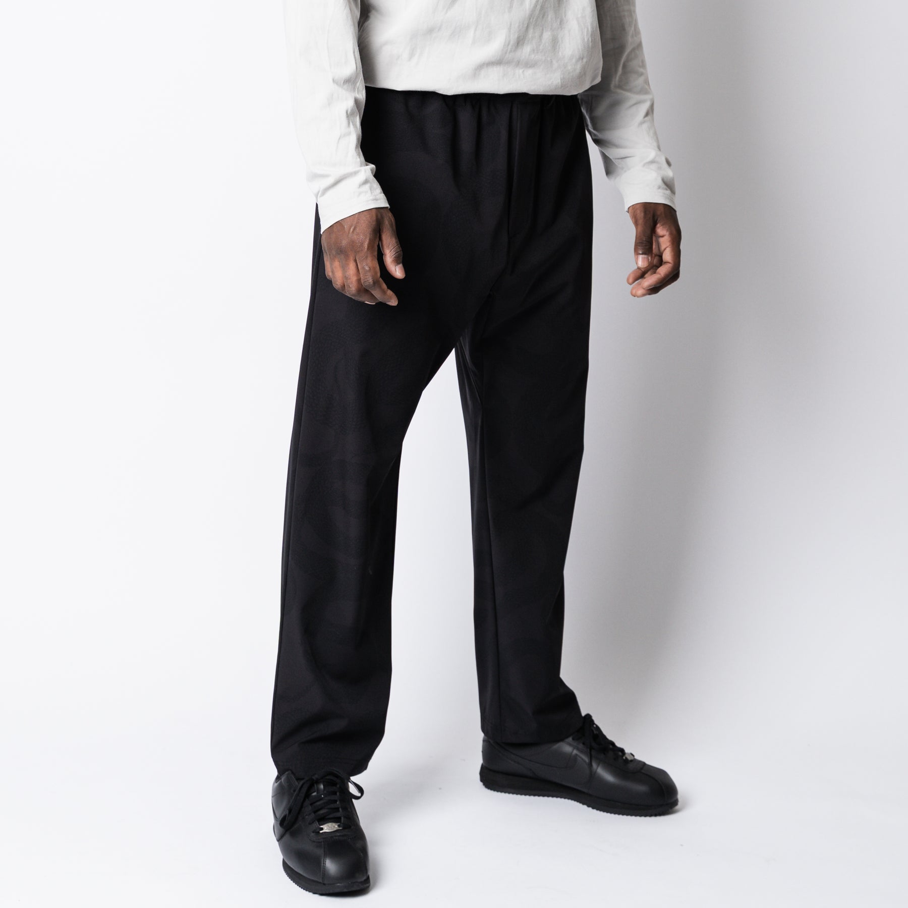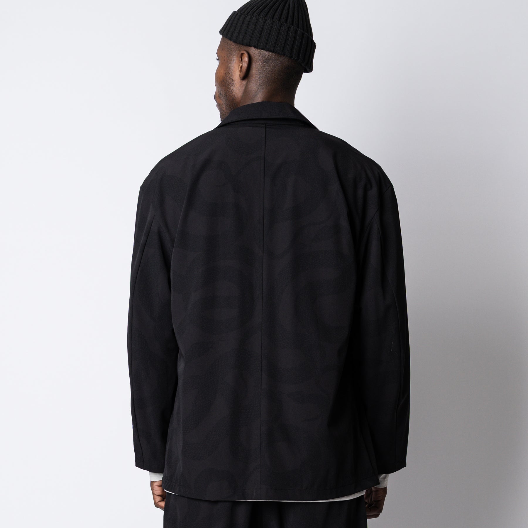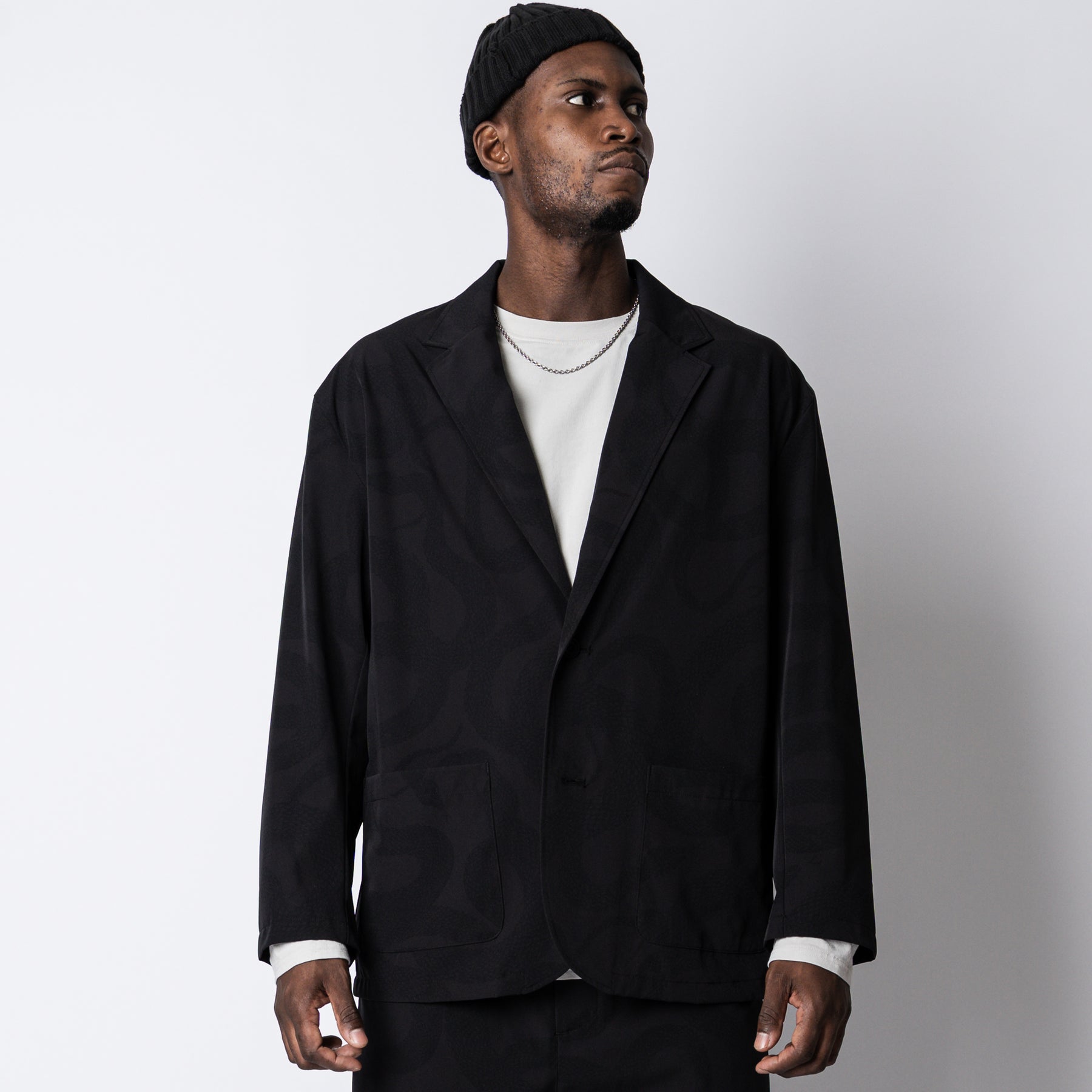 運動が溶け込んだライフスタイルを送る大人へ向けて、ワードローブを質的に豊かにするユーティリティウェアを提供するブランド、"ovys (オーヴィーズ)"とのコラボレートアイテム。伸縮性のあるナイロンボディーを使用し、ブランドオリジナルのSNAKE PATTERNを同色で落としたデザイン。 上下セットアップ展開のトラベルジャケットとスラックス。