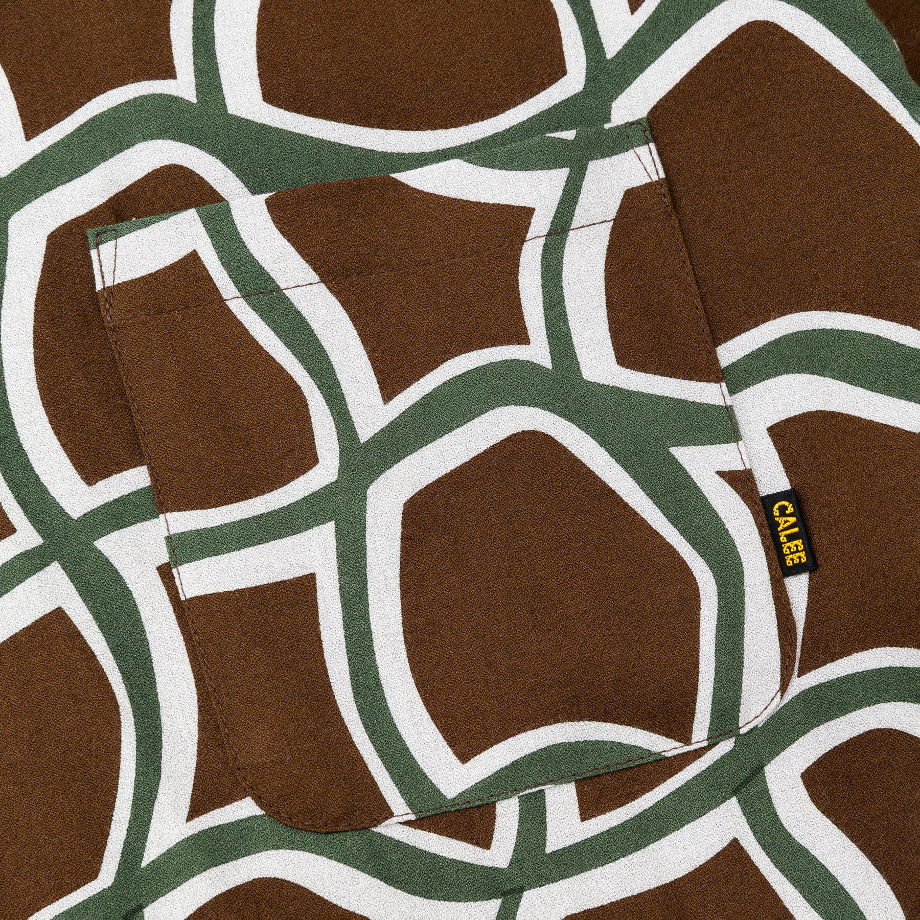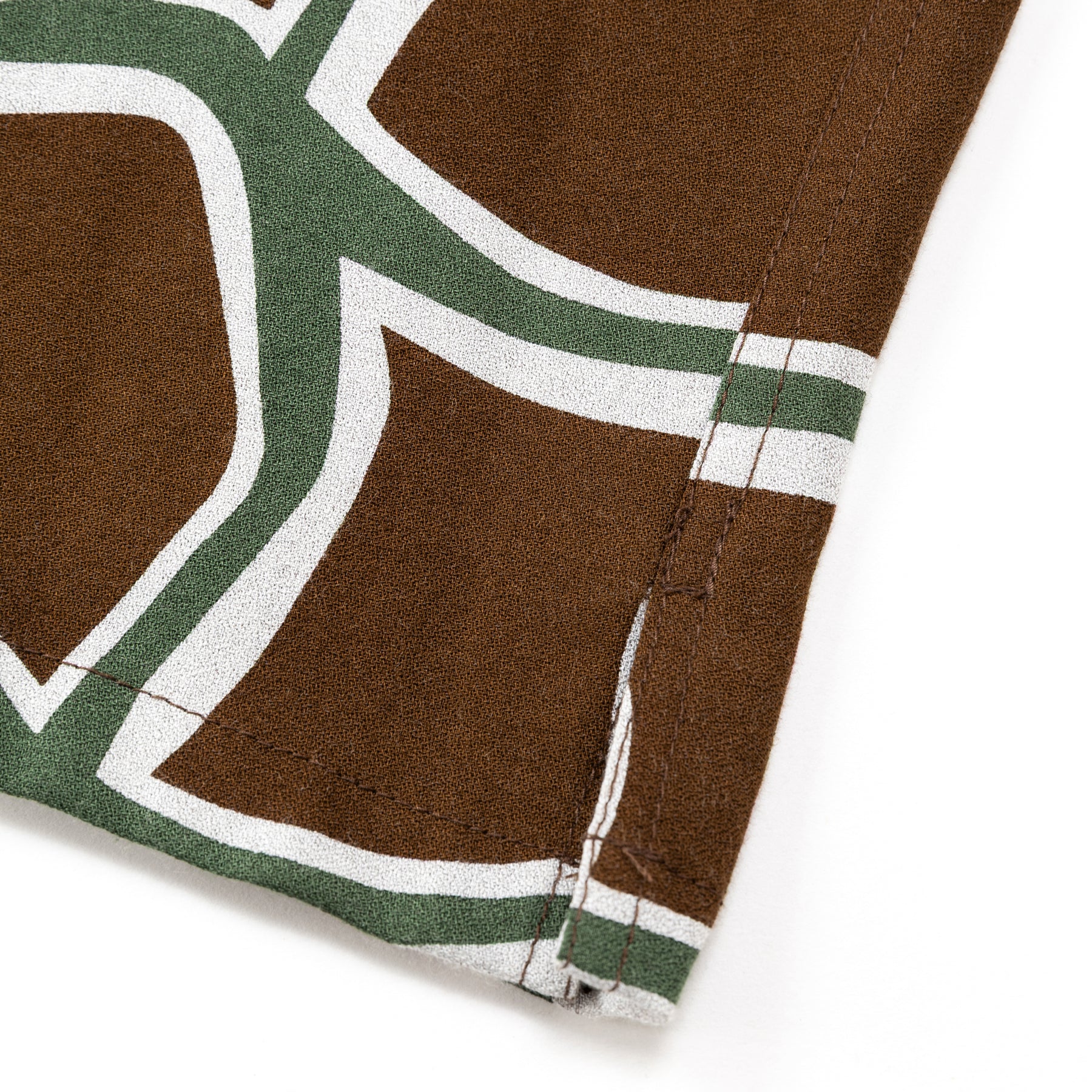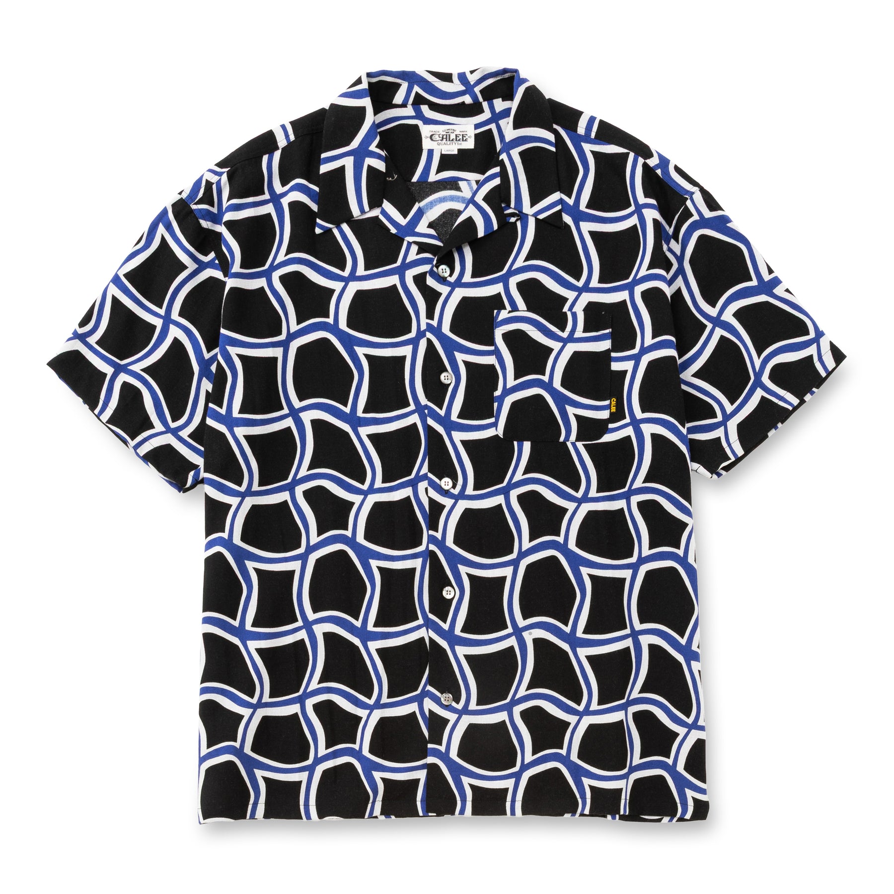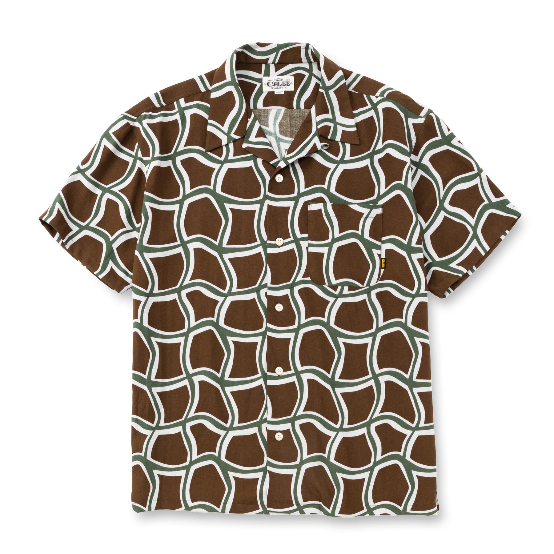 歪みチェック オープンカラーS/Sシャツ。ポリエステルの芯にレーヨンを巻き付けたコアヤーン糸を作り、アムンゼン組織にて製織した生地を採用。表面はレーヨンでもポリ芯に撚ることでシワになりにくいのが特徴。