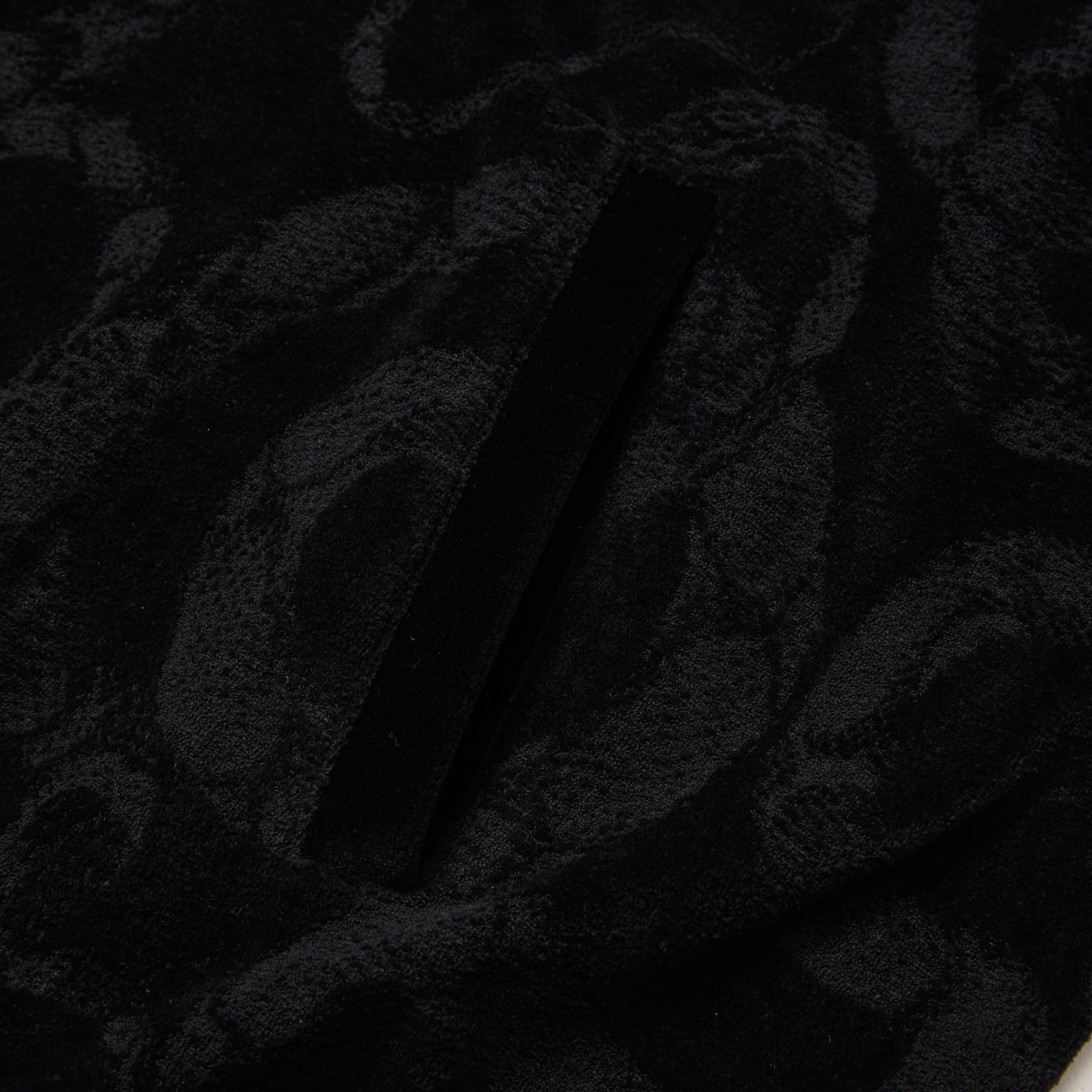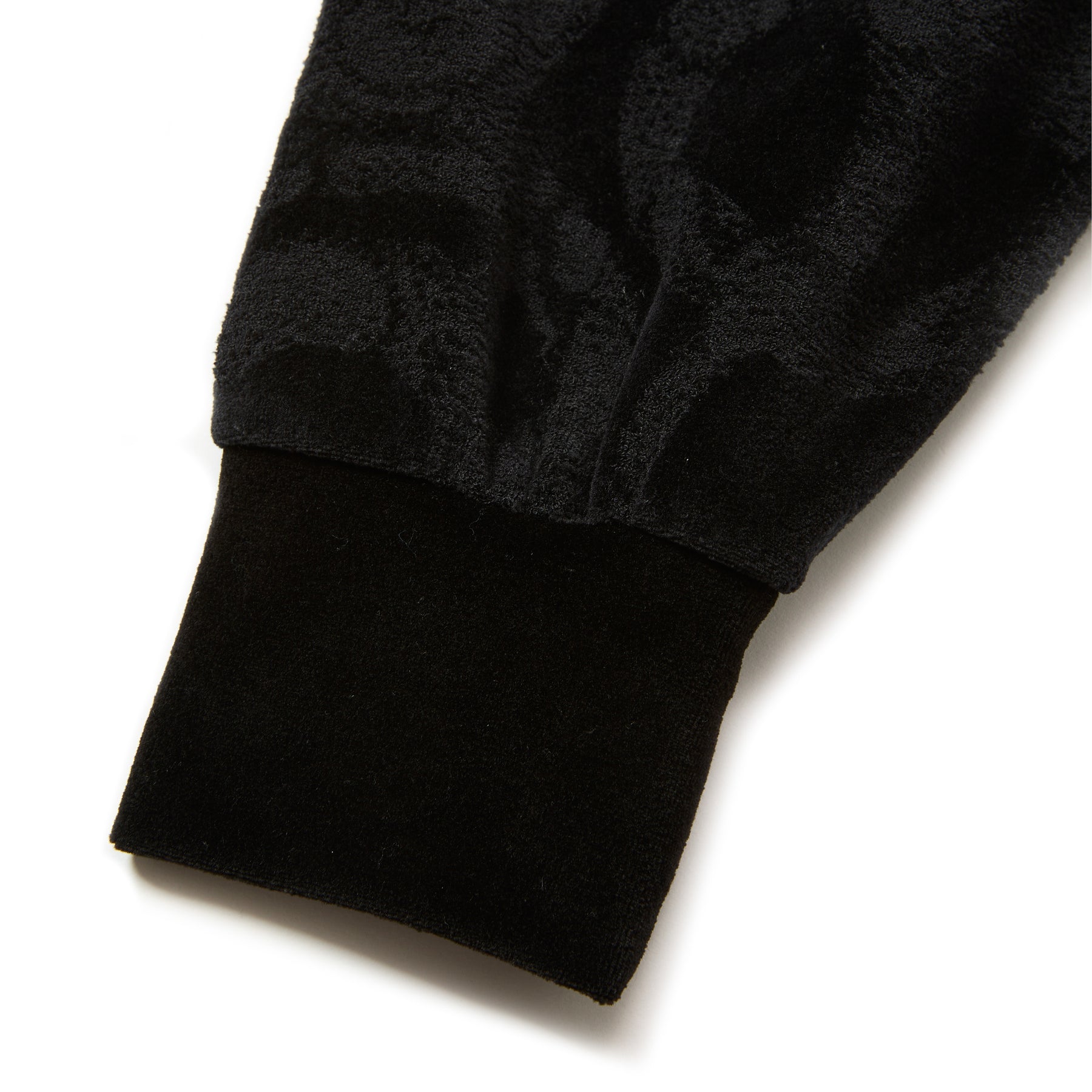 ジャガード総柄ベロアリブジャケット。定番のスネーク柄をジャガード織りにて表現した肉厚なベロア生地を採用。生地の工程全て国内工場で行っている。襟、袖口、裾、ポケット口は無地ベロアで切り替え。