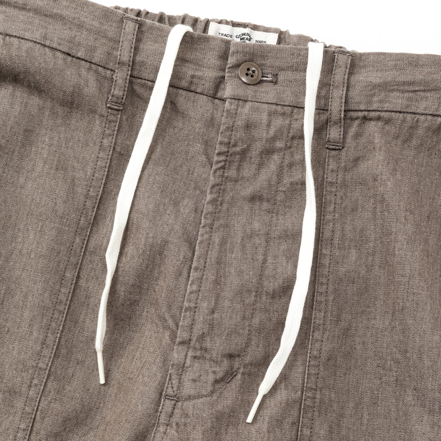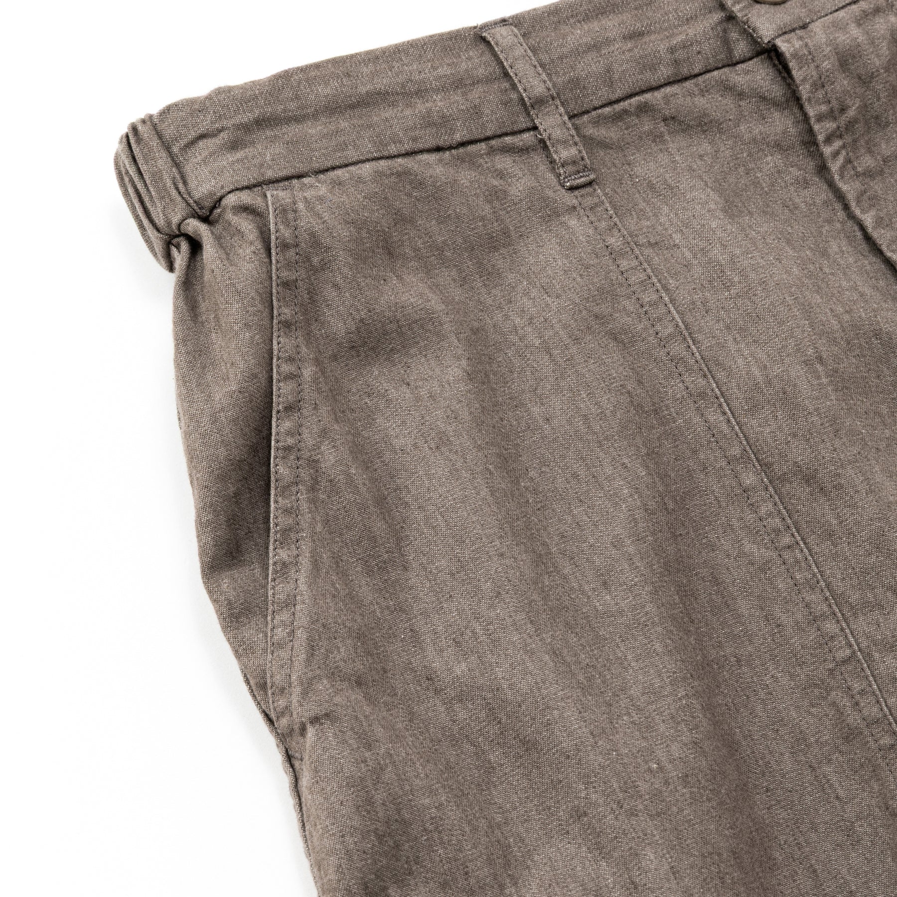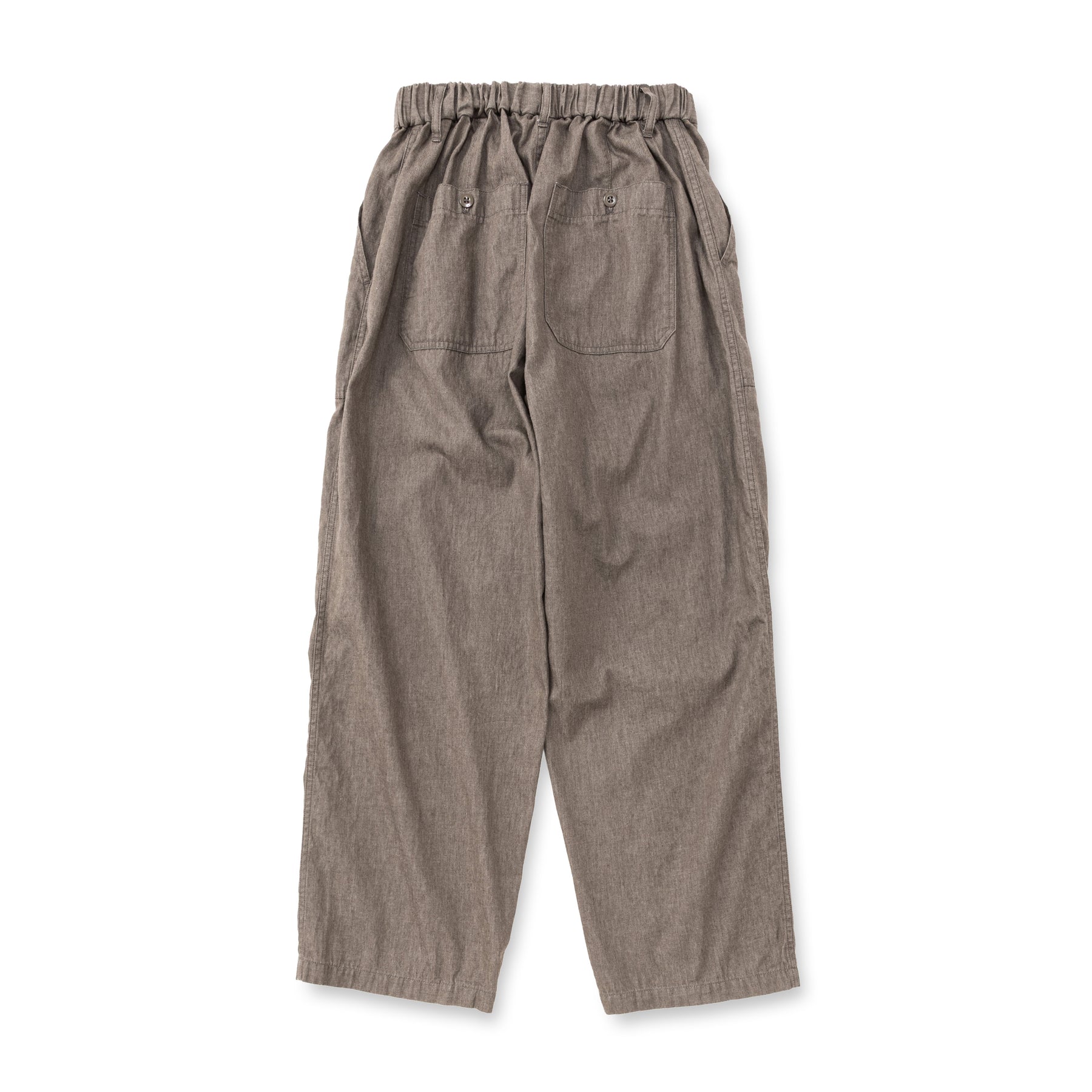 ライトデニムベイカーパンツ。染色から加工までの工程を全て備後産地で行っている、6ozライトデニムを採用。21綾にする事で薄地ながら、適度な張りと強度があるのが特徴。芯まで染まり切らないロープ染色なので、経年変化も楽しめる。ベルトループ付きのウエストゴム、紐仕様。ワンウォッシュ仕上げ。