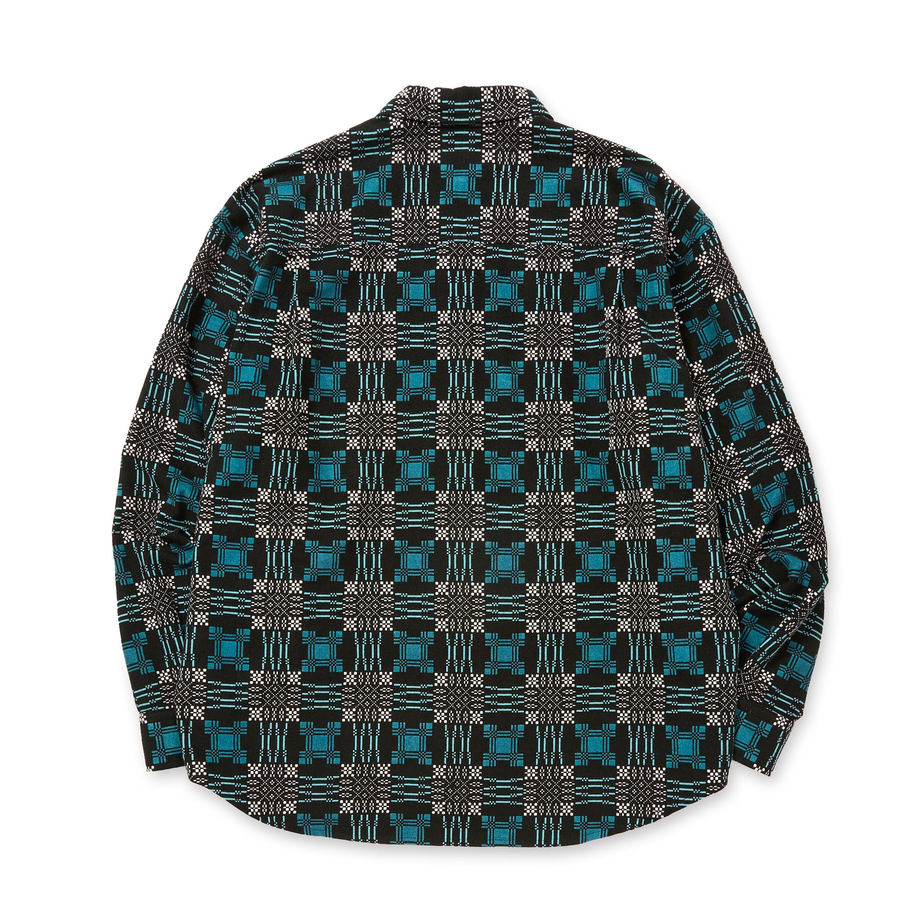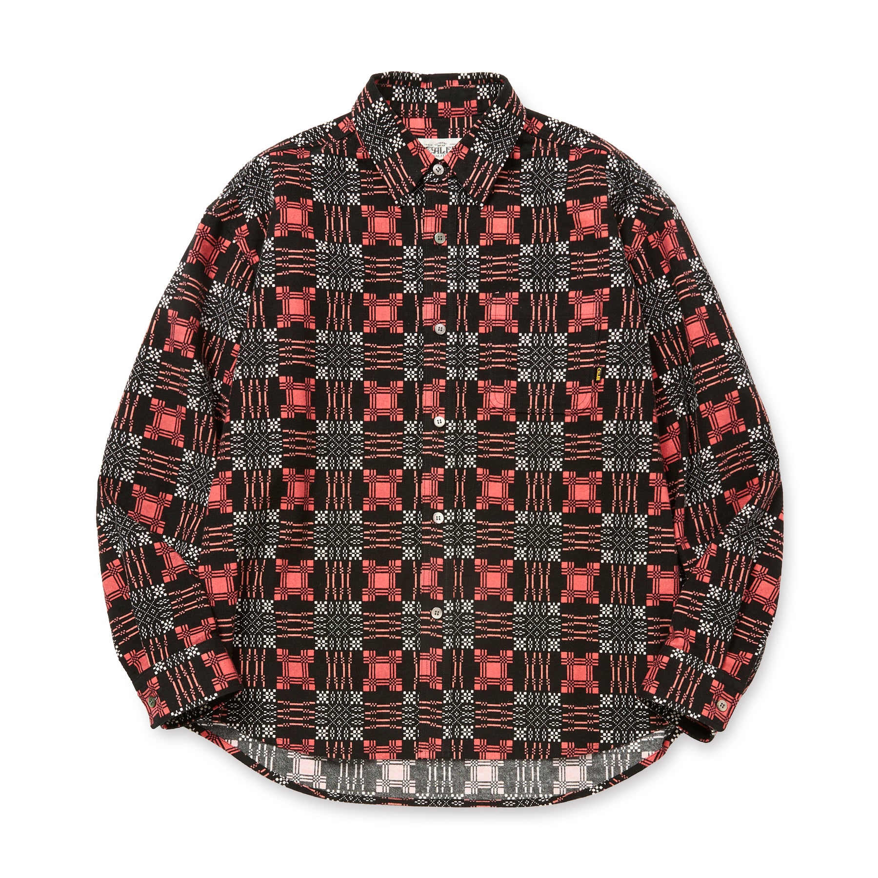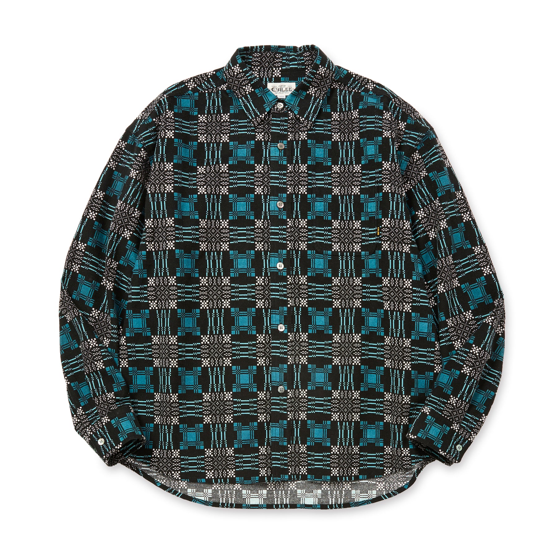 プリントネルL/Sシャツ。オリジナルチェック柄をプリントしたネル生地を採用。2柄共綿の20x20/2の肉厚なネル生地に先起毛を施し、横浜手㮈染にて良く浸透させる為4回刷りしている。横浜手㮈染とは120年の歴史ある染色技法で、熟練の職人によって一枚一枚手で染色していく技術。鮮やかな発色、確かさ、繊細な多色プリントなど最高峰の表現。身幅にゆとりを持たせた台襟ラウンドシルエット。