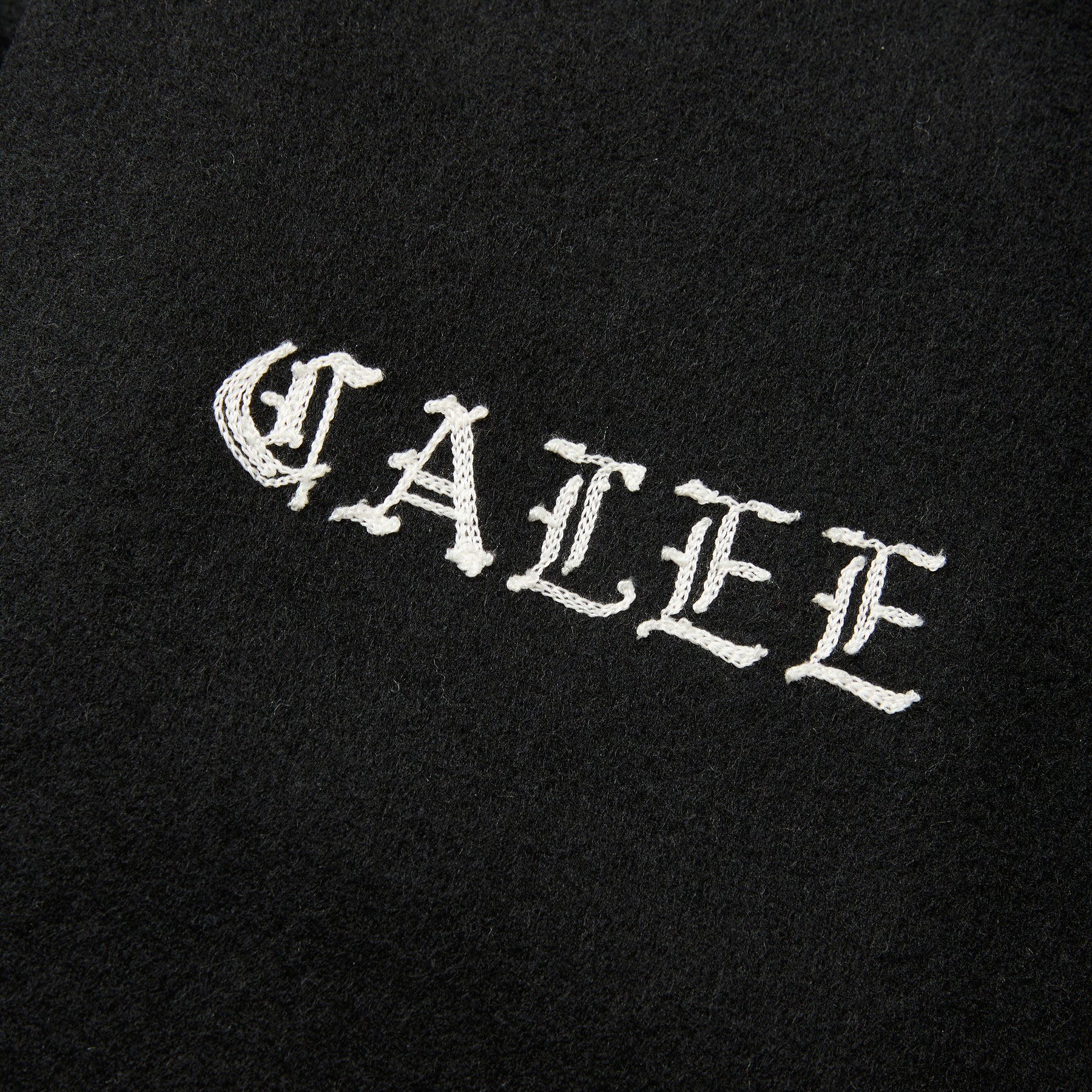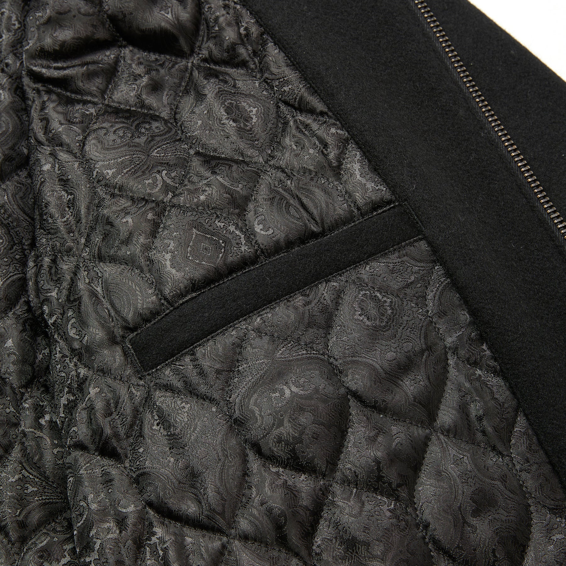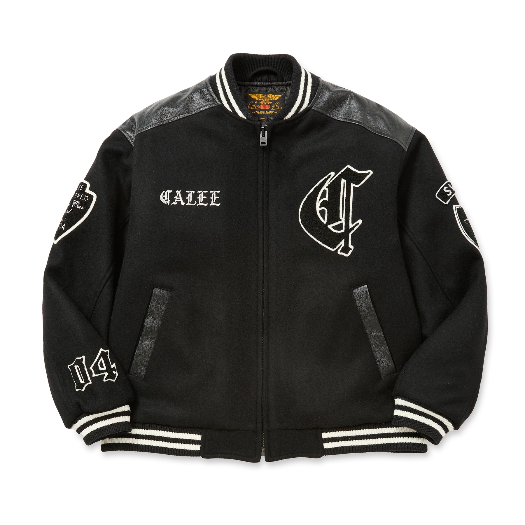 ウールメルトンスタジャン。打ち込みが強い、ウール混率90%の国産の高品質ウールメルトンを採用。ヨーク部分をレザーで切り替え、裏地はオリジナルペイズリー柄の中綿キルト仕様。左胸、両袖にサガラワッペン、右胸、バックにチェーン刺繍が入る。