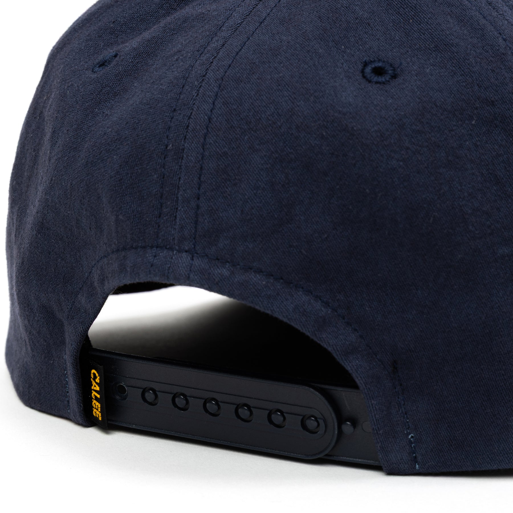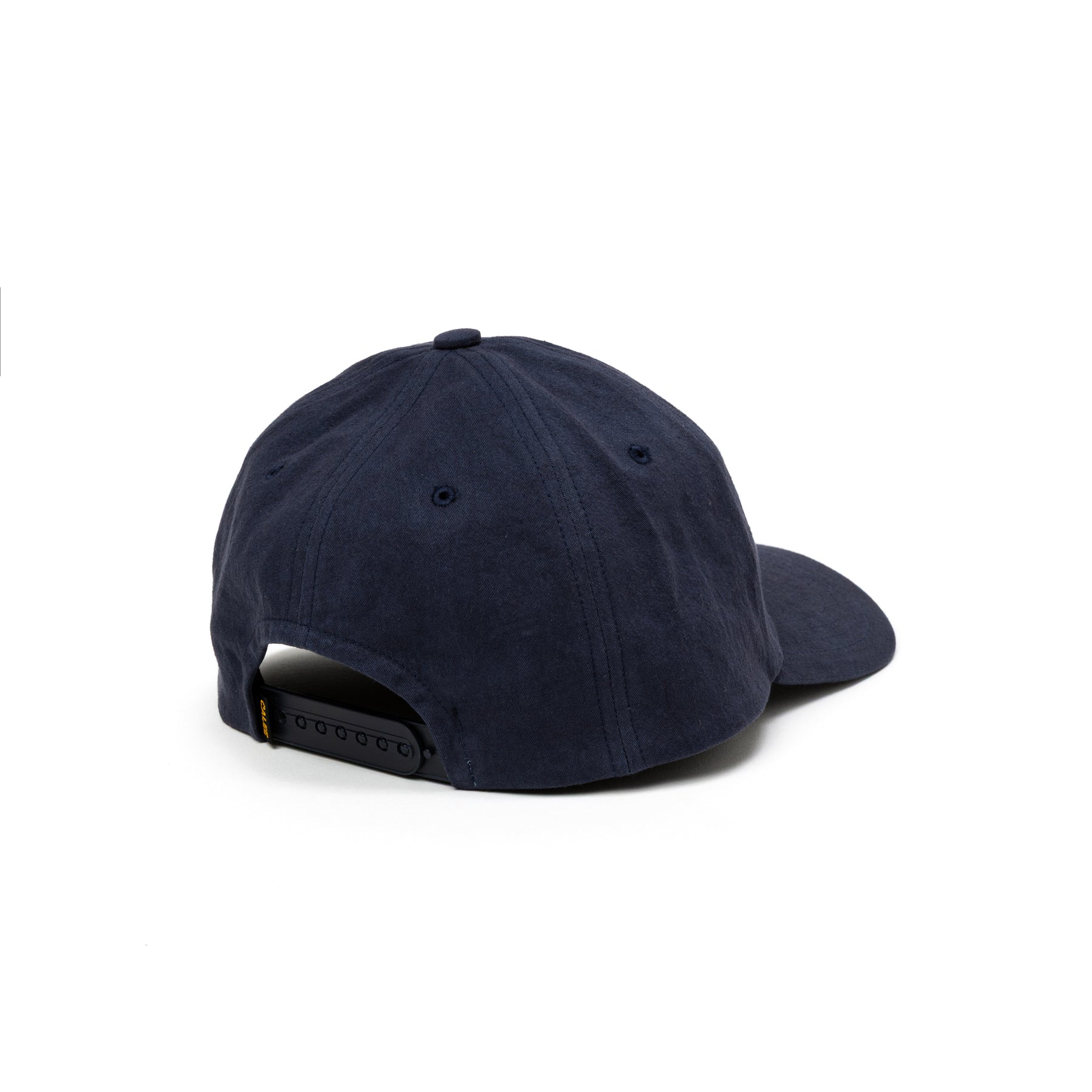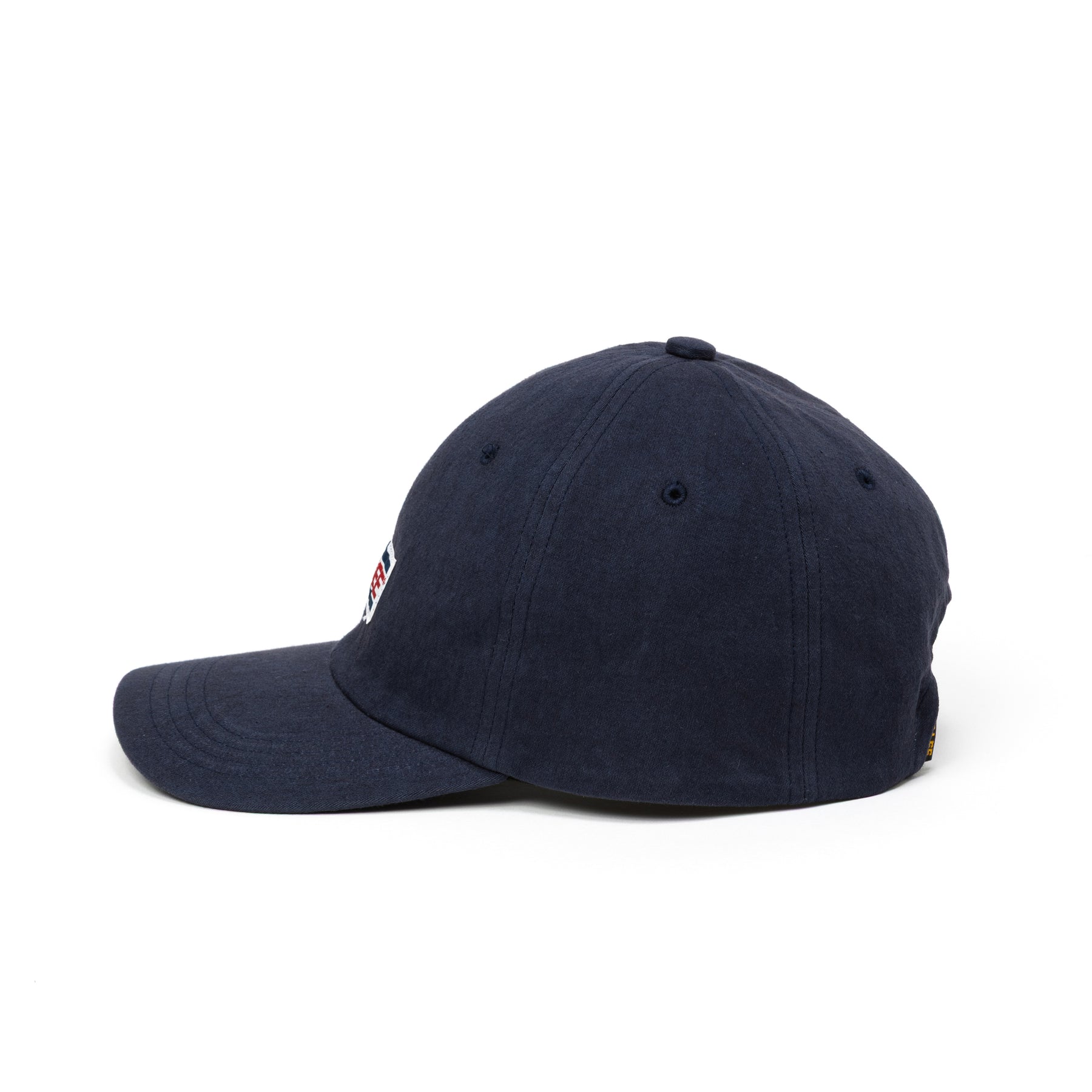 スラブサテン浅型CAP。経糸に20番手の空紡糸を、緯糸に16番手の空紡糸のムラ糸を使用する事で、横方向にスラブ感のあるサテン生地を採用。染色後仕上げに天日干しで乾燥させナチュラルなワッシャー感が特徴。フロントにネームが付く。スナップバック仕様。
